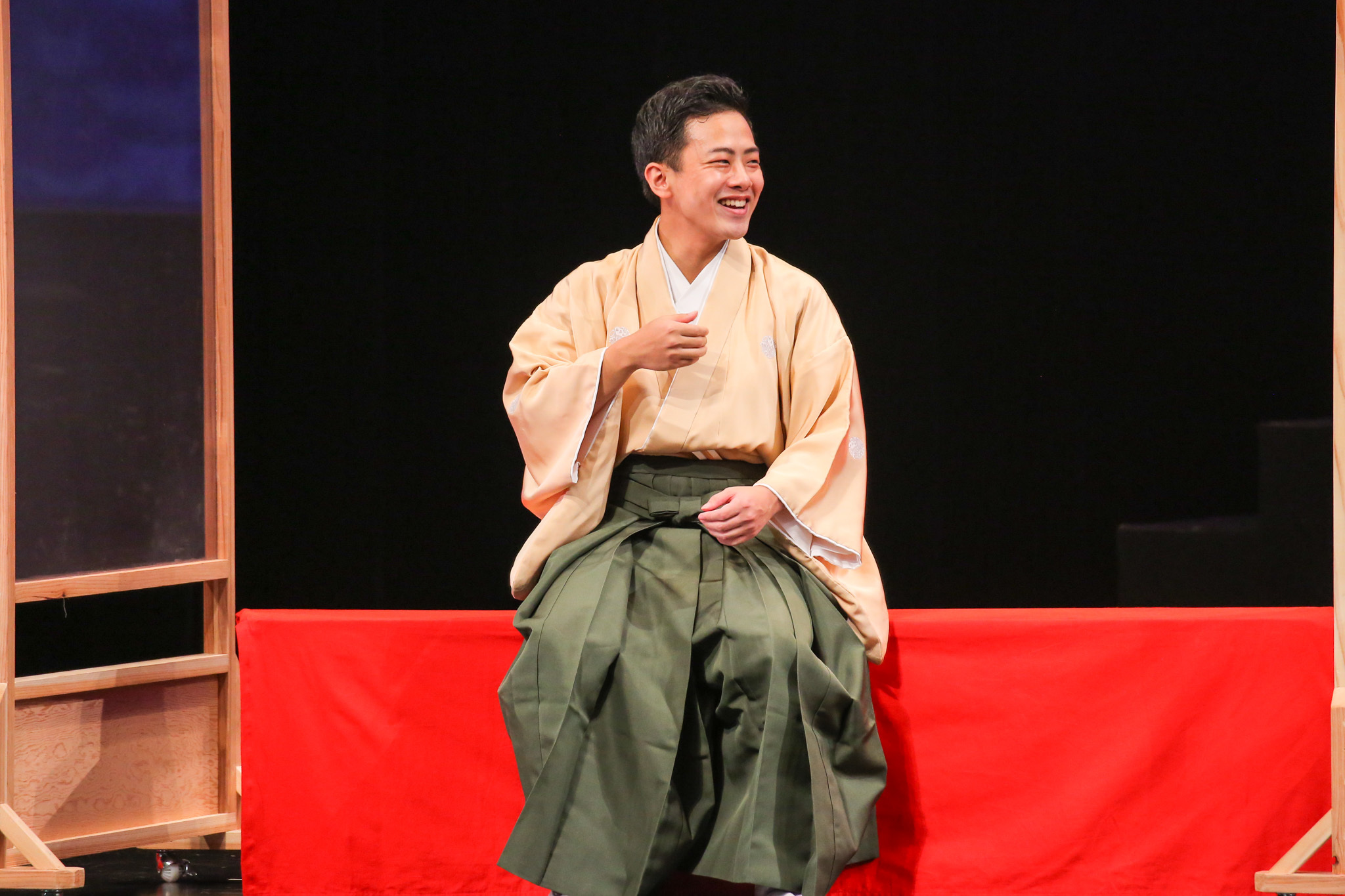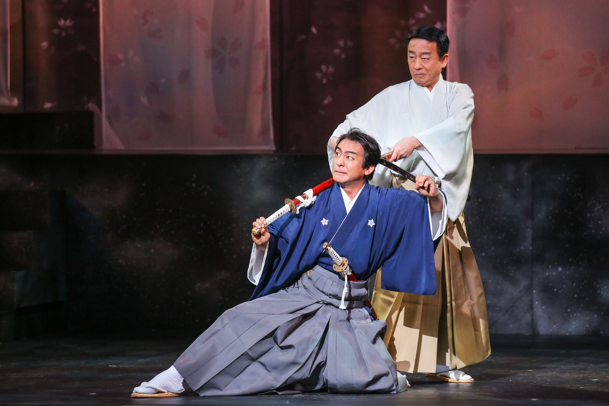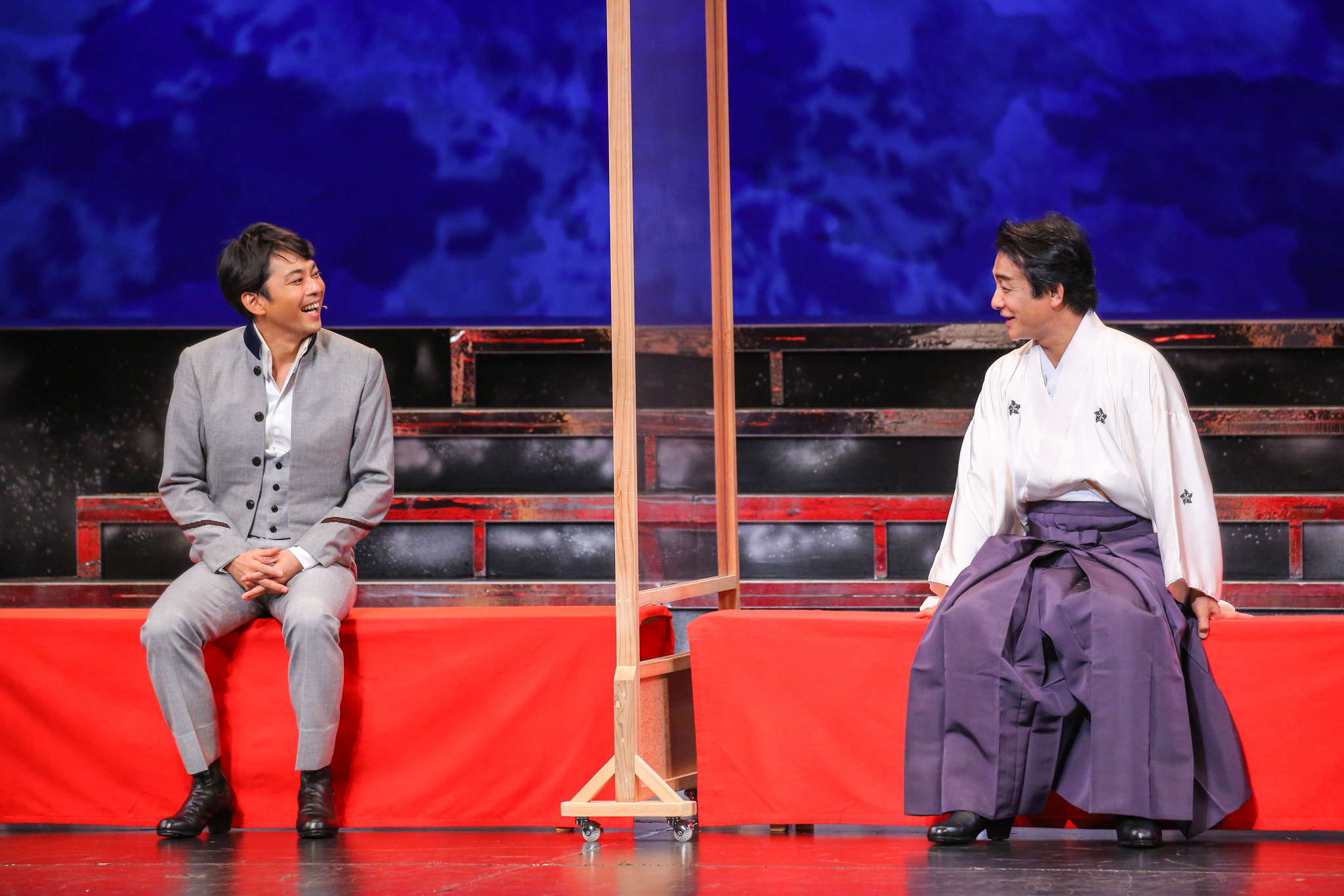 前半の見どころは、なんといっても俳優が素の状態で演じる点だ。『GOEMON 石川五右衛門』では主演の石川五右衛門を演じる愛之助を筆頭に、奇抜な化粧やかつら、衣裳をまとう俳優たちだが、今回は皆、はかま姿で化粧もしていない。極めてシンプルながらも、いざ彼らが舞台に立つと、指先からつま先まで動きの一つ一つがクリアに見え、表情も分かりやすい。俳優たちの一挙手一投足に集中することができ、十分に楽しめた。