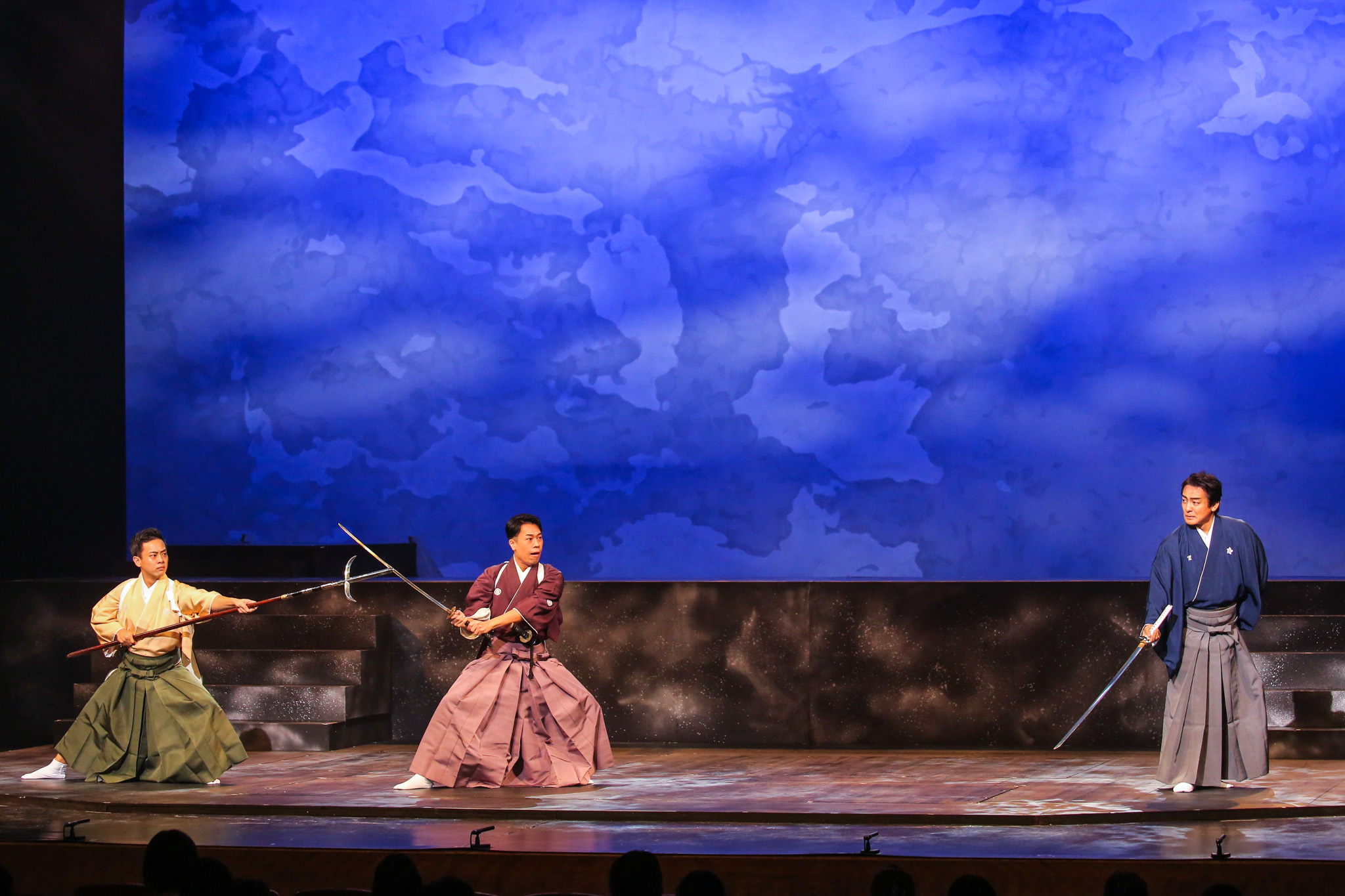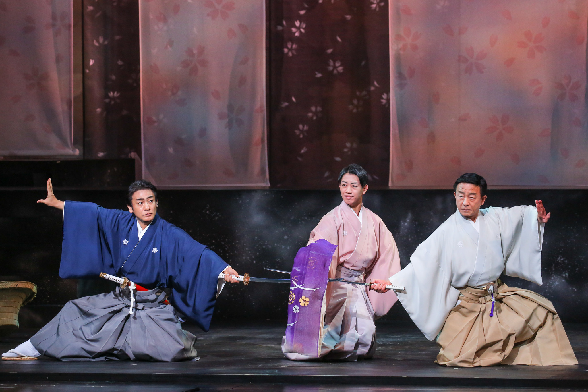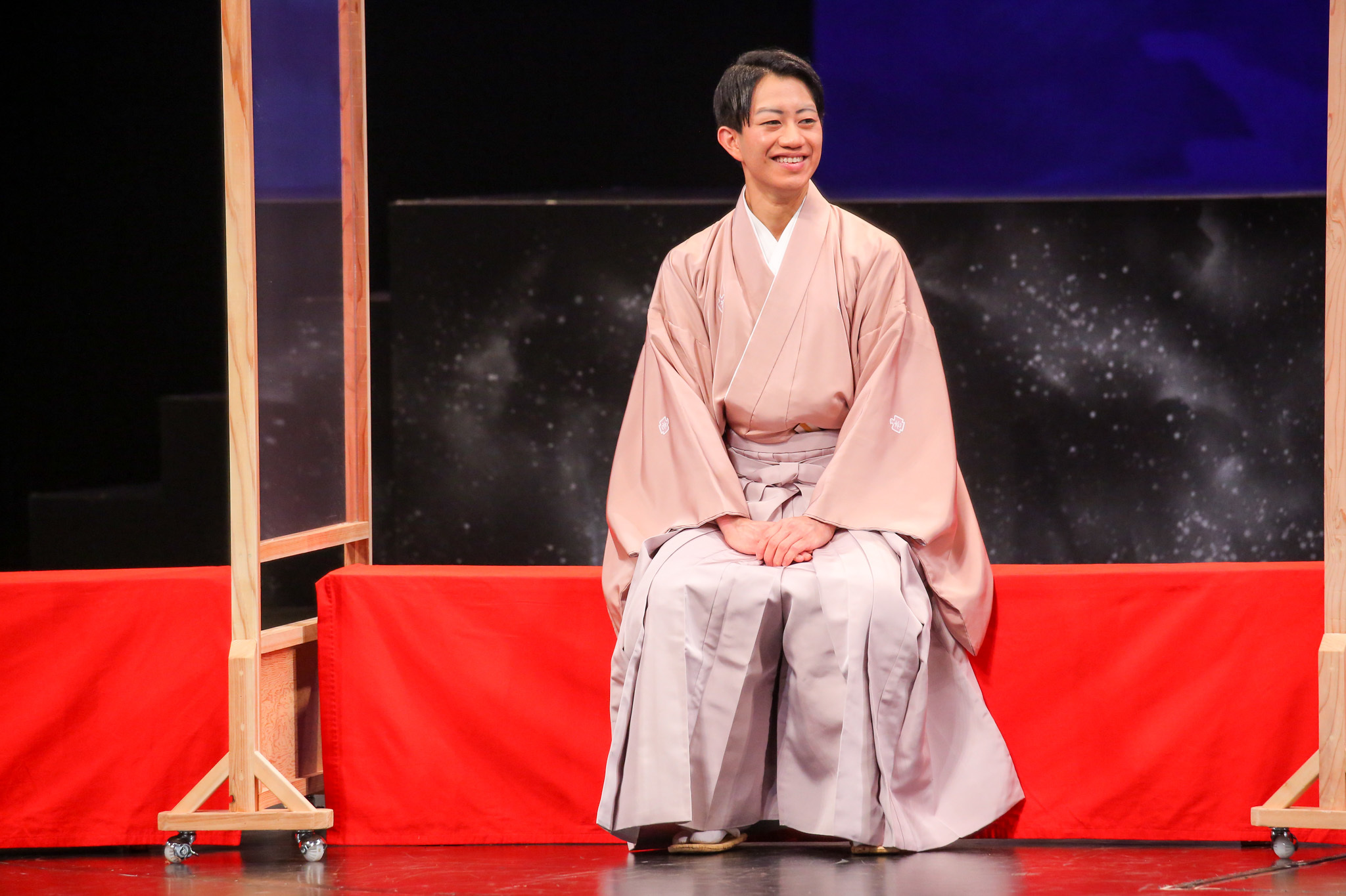 前半の見どころは、なんといっても俳優が素の状態で演じる点だ。『GOEMON 石川五右衛門』では主演の石川五右衛門を演じる愛之助を筆頭に、奇抜な化粧やかつら、衣裳をまとう俳優たちだが、今回は皆、はかま姿で化粧もしていない。極めてシンプルながらも、いざ彼らが舞台に立つと、指先からつま先まで動きの一つ一つがクリアに見え、表情も分かりやすい。俳優たちの一挙手一投足に集中することができ、十分に楽しめた。