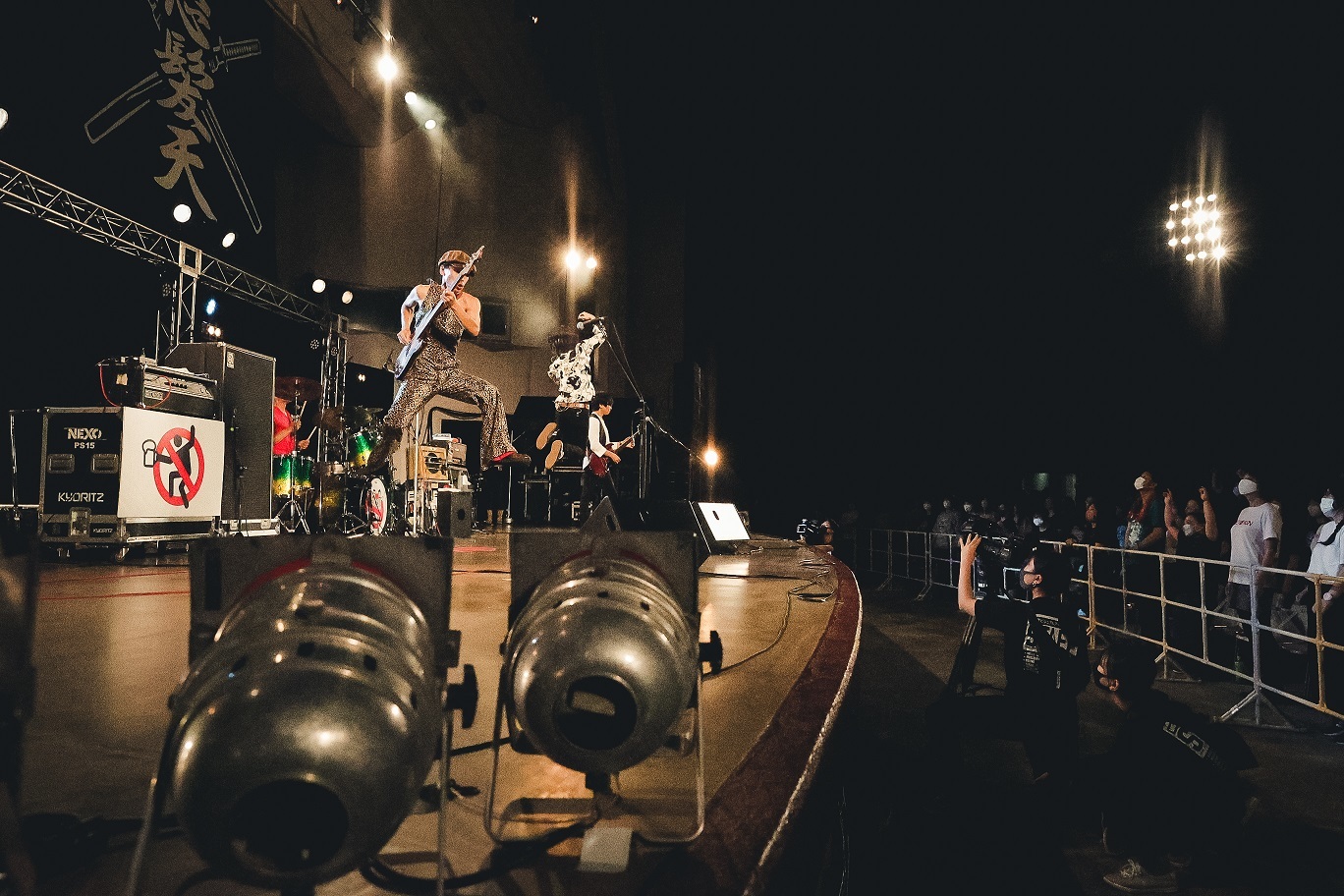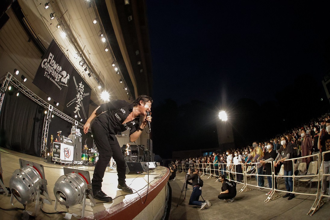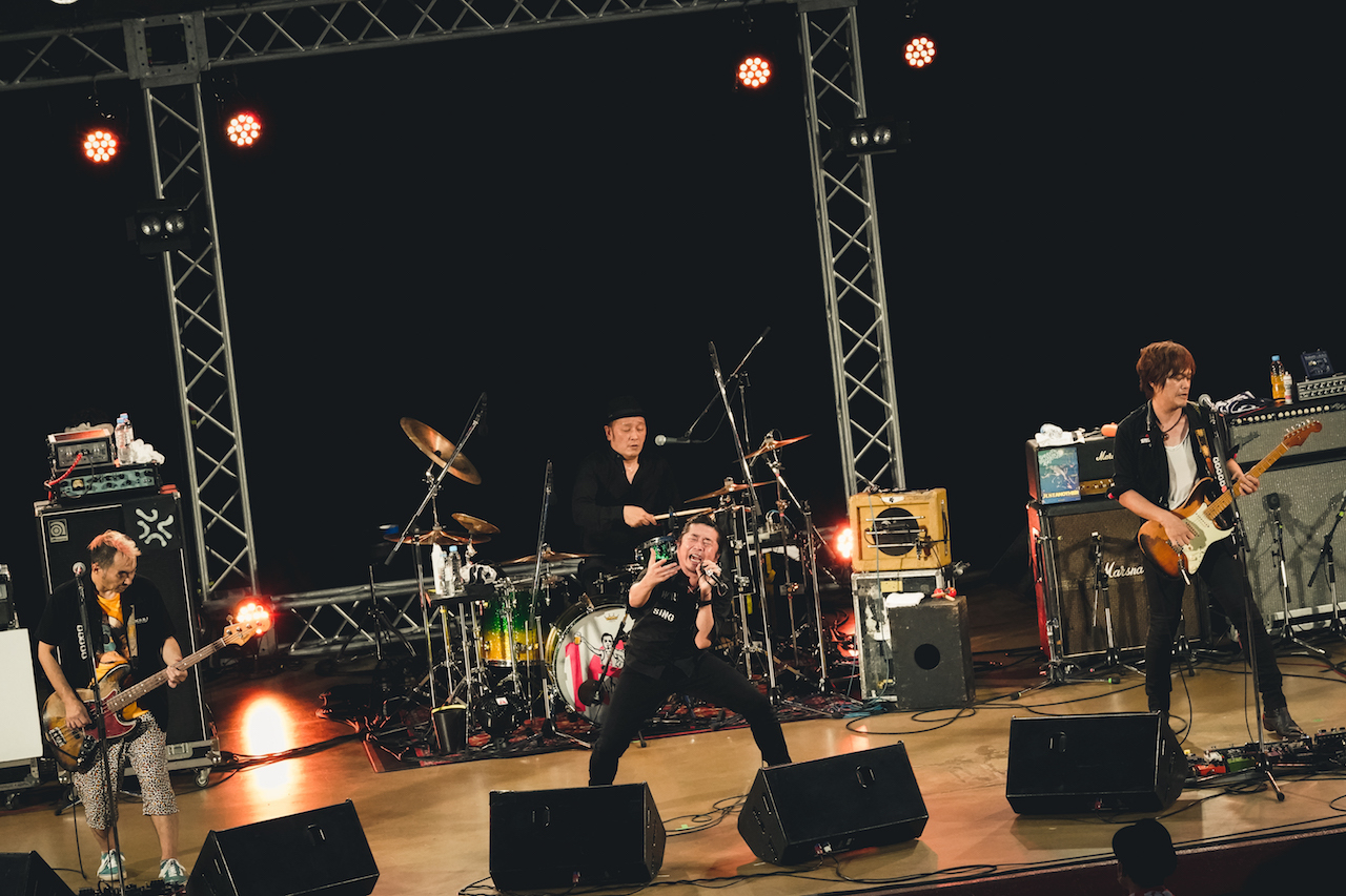 まず、今回のイベント主催者、そして『音泉魂』の主催者でもある関西の名物イベンター・清水音泉の番台(代表)こと清水 裕氏が挨拶を。「キッカケを与えて下さったミスター小西(フラワーカンパニーズ・Dr)さんと後押しをして頂いた増子直純(怒髪天・Vo)先輩に感謝したいと思います」と言って、場内をほっこりさせた後、「ご負担をかけてる思います」とちゃんと観客を思いやり、ライブ鑑賞のルール説明をする。前日、同じ大阪城野音で開催されたイベントに出演した四星球の北島康雄は、「ライブは不必要にされていたけど必要だ」とMCで話したという。そして、そこに清水さんは「面倒や不安を抱えてきたみなさんと必要なものを確認したいと思います!」と言葉を添えた。このような丁寧な前説があるだけで、場の雰囲気は全然違うものになる。