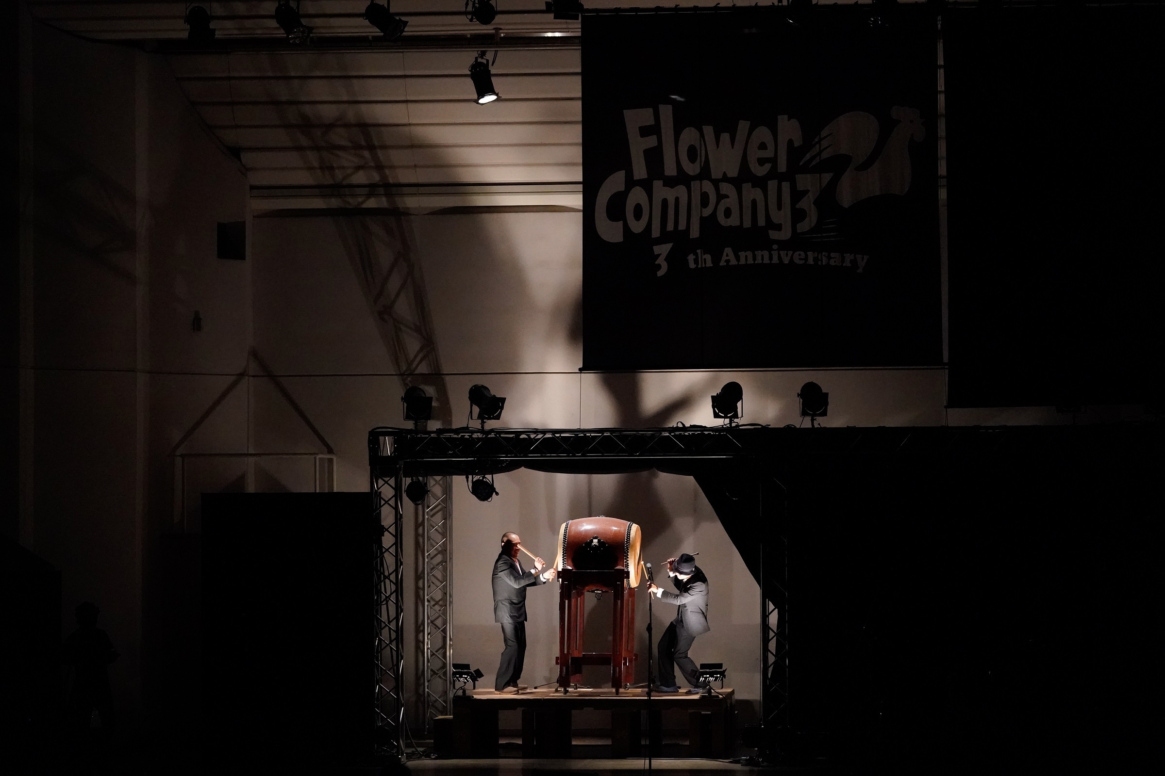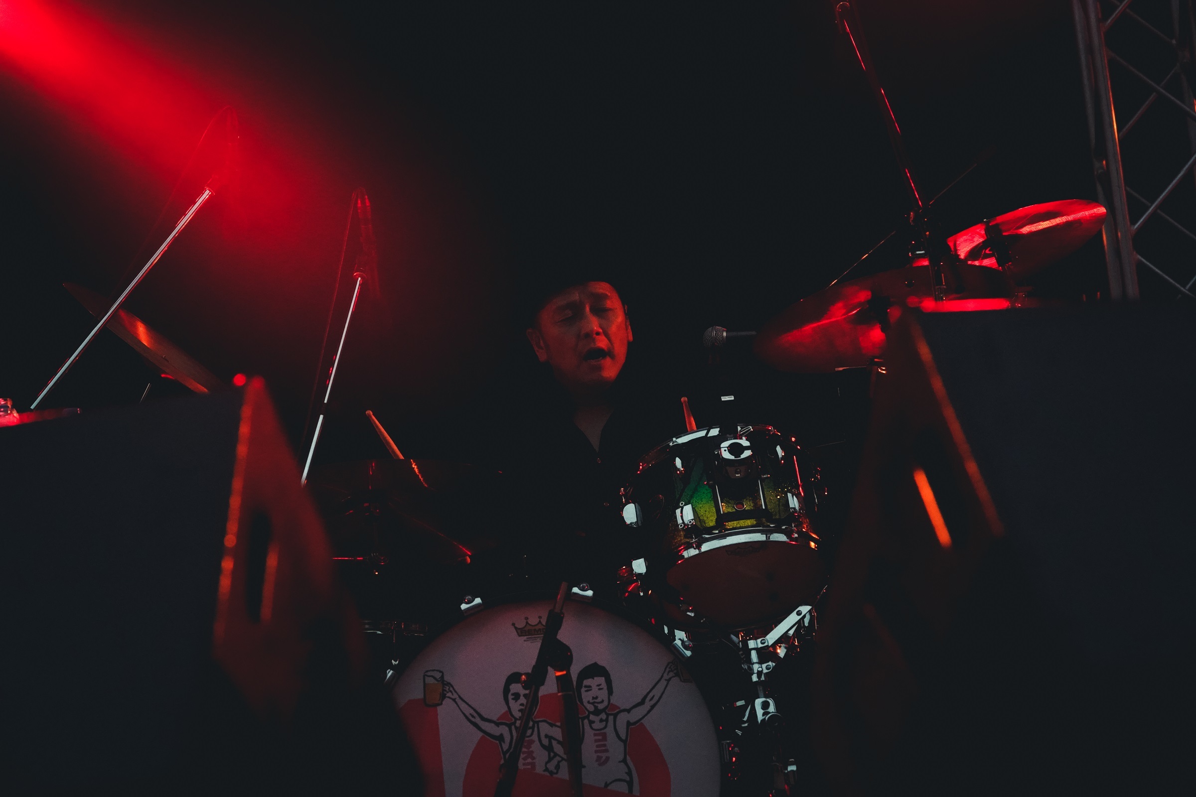 ジャンピング乾杯10周年という企画をすっかり忘れるくらいの真剣勝負一騎討ち……だった、ここまでは……と書かざるを得ないお楽しみ会がアンコール的に勝手に開幕! ステージ後ろの黒幕が剥がされると黒スーツを着たブルースブラザーズみたいな怒髪天の坂詰克彦(Dr)とフラカンの小西というドラムふたりが和太鼓を叩く。