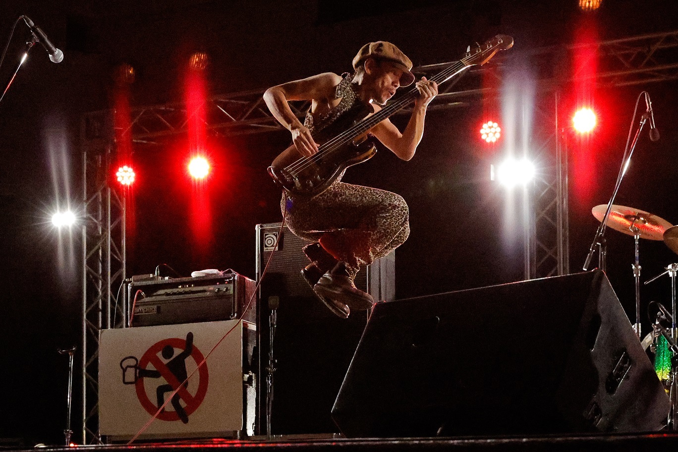 続く「トラッシュ」では竹安堅一(Gt)のギターが火を吹き、鈴木圭介(Vo)のハープも火を吹く。<地ベタをはい回って生きてる 黒光りの茶羽が目印だ>、<もっと とととと ゴキブっていけ>という或る意味ハードコアな歌詞に<飛べ 飛べよ 飛べ>とサビの歌詞が覆い被さっていく。ぶっといビートが最高に燃える。圭介はドラムの後ろまでステージ1周走っている。51歳のボーカルとは思えない爆発的ステージング。怒髪天とは、また違う狂気を感じる泥んこ全力野球ライブ。