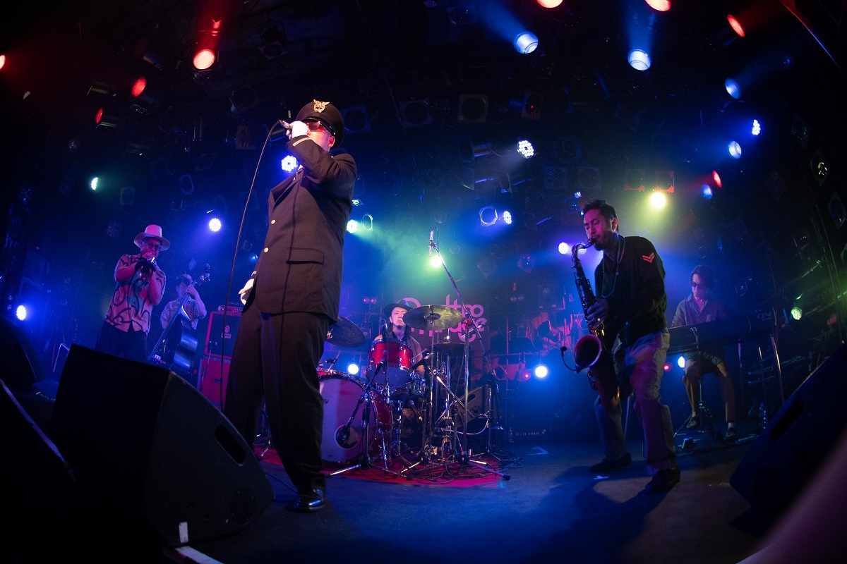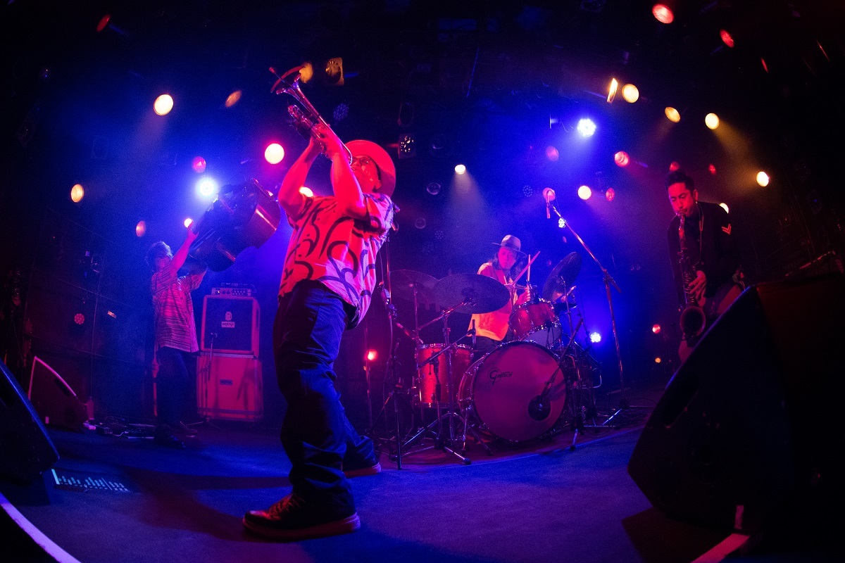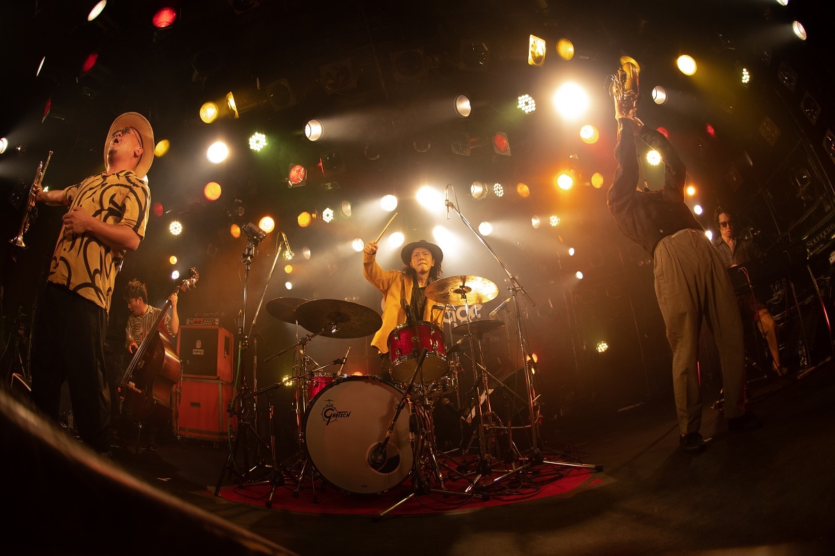 からの、藤田の強烈なブロウが炸裂する「Guns of Saxophone」が、ライブ終盤のラストスパートを告げる合図だ。サックスとトランペットのツートップが攻めまくり、関谷までがベースを引きずりドラムの横で激しいフレーズを弾きまくる、これは誰も守備をしない超攻撃的フォーメーション。「Sand Castle」ではついに伊藤もドラムを離れステージ前方に躍り出て、「好きに踊ろうぜ!」と叫ぶ。織田と藤田はモンキーダンス、もはや何でもありの無礼講パーティー。そしてラストを締めくくるのは、『Turn On The Light』からのボーカルナンバー「For The Loser」だ。「画面の向こうの人は大声で、会場にいる人は心の中で、一緒に歌おうぜ!」――伊藤の煽りに応え、♪OhOhOh、という観客全員のコーラスが会場に響き渡る。いや実際には聴こえないが、熱い思いは確かにここにある。