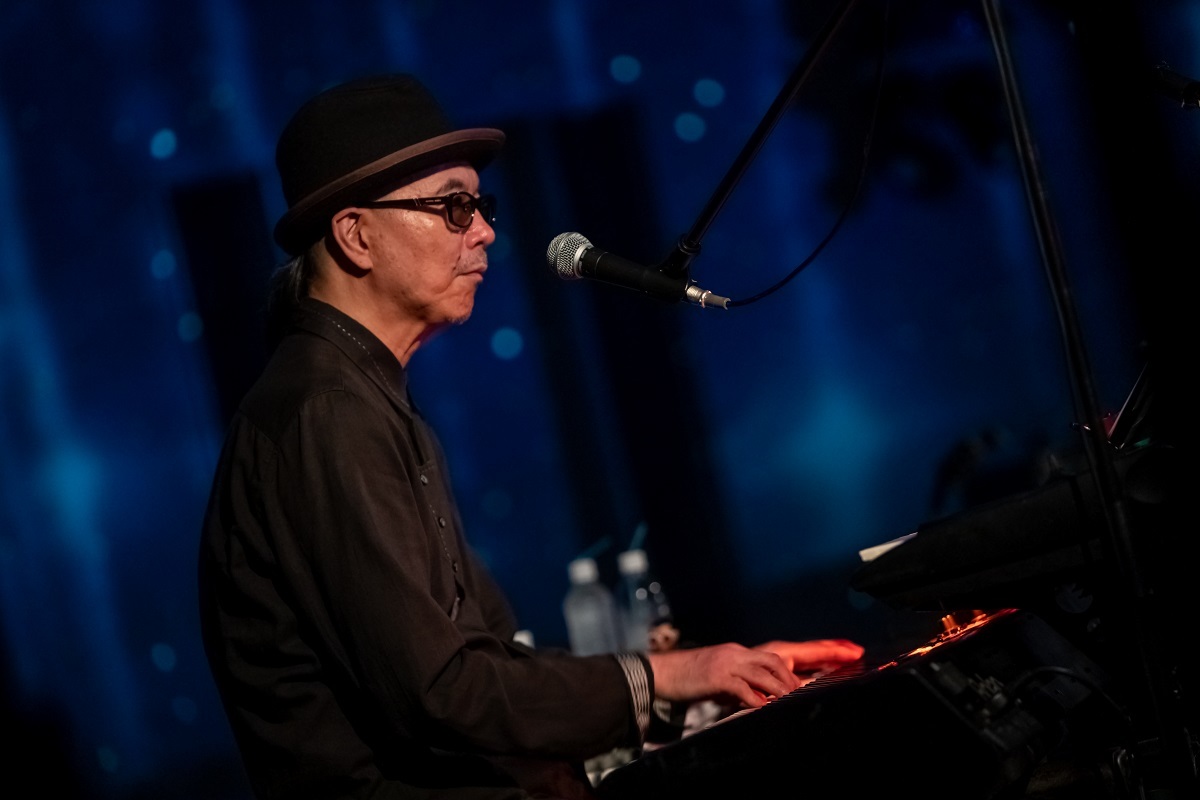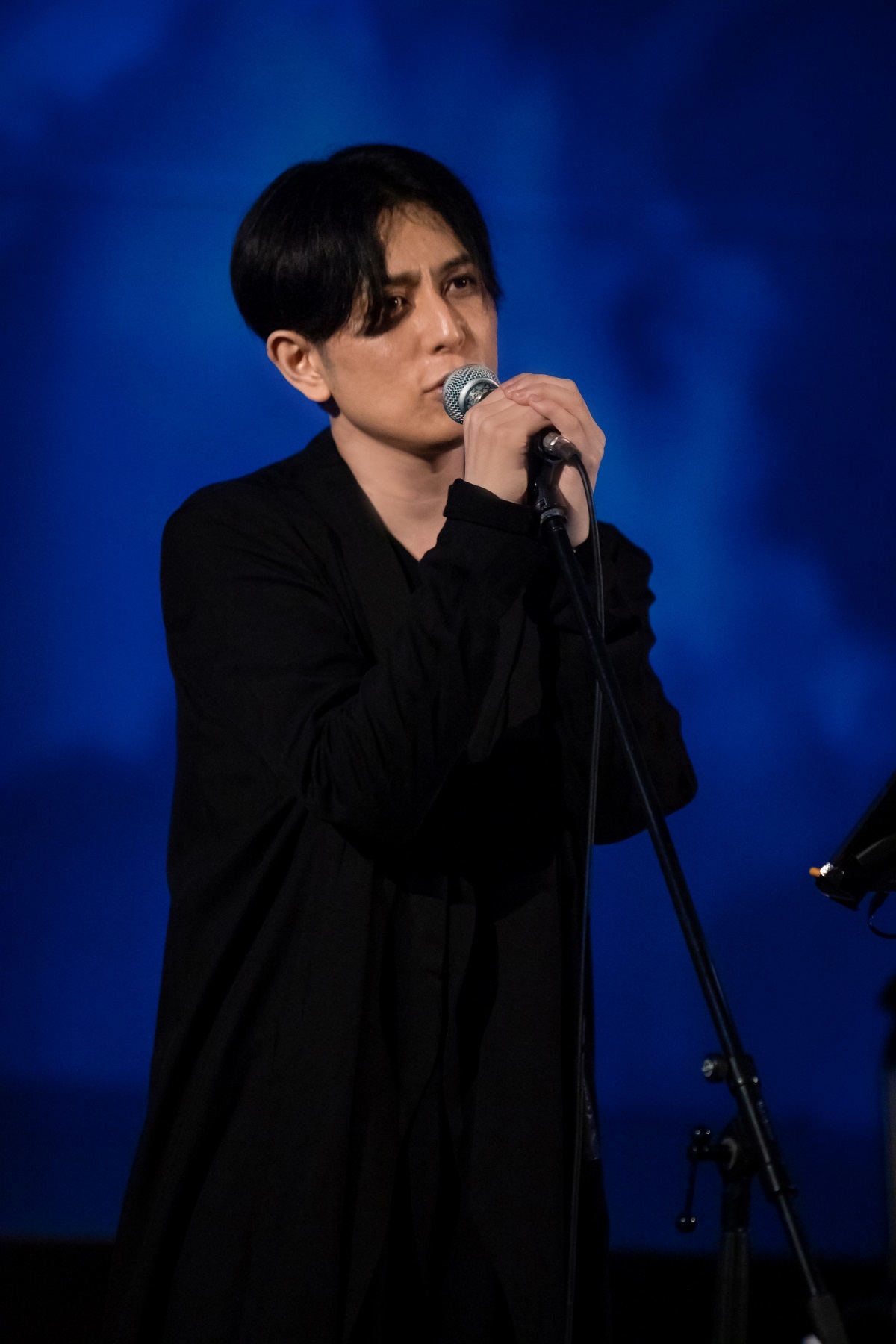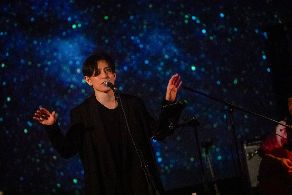 ひときわミニマムなサウンドにのせて、穏やかな中低音域のボーカルが優しく語りかけたのは、まさに星空の下にぴったりなナンバー「アンドロメダ」。その静謐なムードを引き継いで、ハナレグミの永積タカシ、クラムボンの原田郁子、Polarisのオオヤユウスケによるユニット=ohana(オハナ)の童謡のようなミディアムナンバー「Heavenly」のカバーへとつなぐ。堂珍の頭上には水面が揺れ、まるで海の底にいるような不思議な空間が出来上がっていた。
