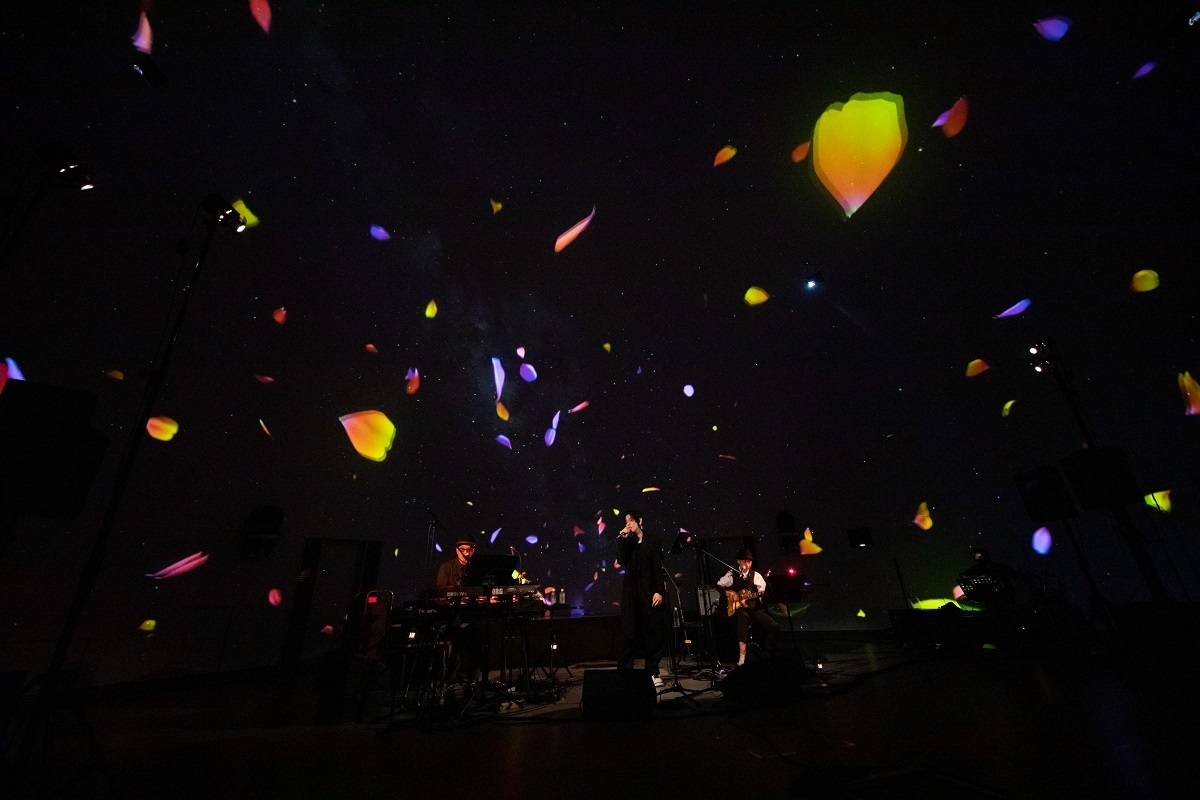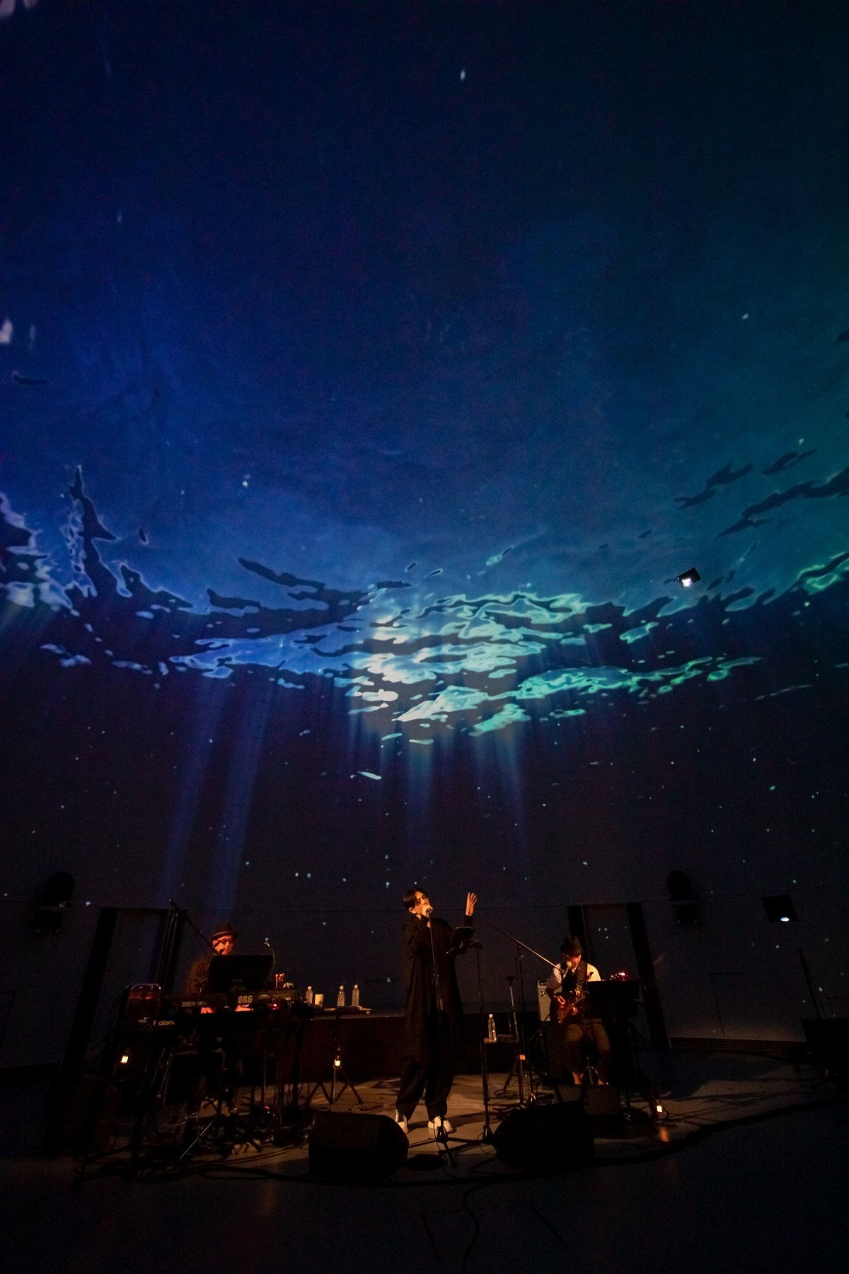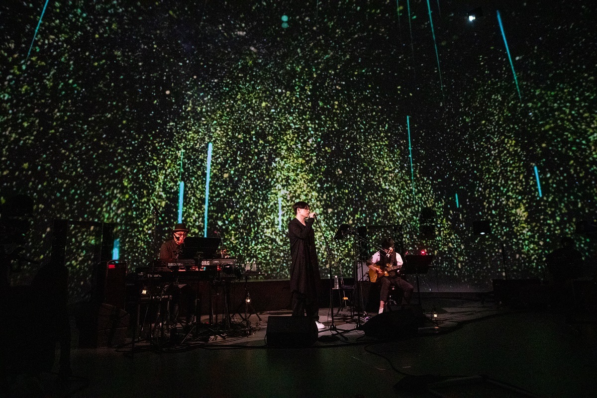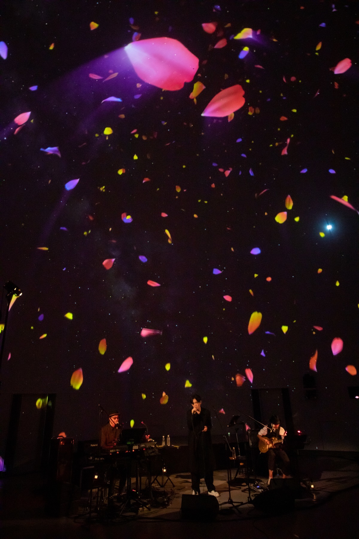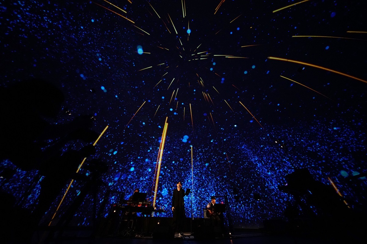 ライブの後半は、何光年の彼方から地球へと光を届ける星々に想いを馳せるように、「レーザーの光もずーっと進み続けて消えません。光が希望だったとして。その光が永遠に消えないようにと作った曲があります」と紹介して、雄大なロックバラード「Lasers」を熱く歌い上げた。真っすぐに駆け抜けてゆく閃光をバックに、“泣かないで 歩き出せ”と紡がれたその歌は、2013年に発表されたソロ第一弾アルバム『OUT THE BOX』の収録曲。だが、誰もが未来に不安を抱えるこのコロナという状況下にあって、いっそう眩い希望の歌として聴こえるような気がした。ブラックミュージックをルーツにするシンガーの真骨頂を感じさせたカバー「Lilac Wine」、鮮やかなサビの転調に合わせて、夜空に星座のイラストが浮かびあがり、ファンタジーの世界に迷い込んだようなCHEMISTRYのソロナンバー「RAINBOW」。1ページ、1ページ、大切に物語を紡いだところで、「やっぱり僕の曲は、空にまつわる単語が多いなと。そういう意味では、プラネタリウムにぴったりだなと自覚しております……なんつって(笑)」と少し冗談っぽく言う場面も。先日、遂にレコーディングを終えたという未音源化ナンバー「My Angle」では、まるで雲の上に立つような開放感のある映像に天使の羽根が舞い落ちた。続けて、大きく刻んだリズムにのせて、“人と人とが信じ合うこと”をテーマにした「How I Love you so」へ。海から空、そして、再び地に足を着けて。空間を次々にワープするような演出と共に進んだライブも残すところあと1曲だ。