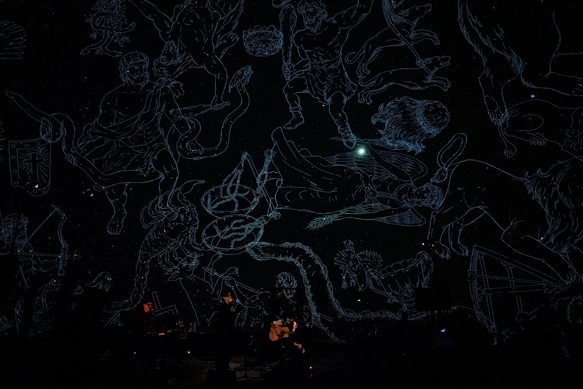「自分のライブとはいえども、もしかしたら、ひとつの大きな物語のような時間になるんじゃないかなと思います。わたしもどこか語り部のような気持ちもあって。一つひとつの歌詞を物語や台詞のように紡ぎ、ふたりの素晴らしいミュージシャンにつないでいただいて、大切な一夜になったらいいなと思います」。そんな言葉を添えて、東京・有楽町のコニカミノルタプラネタリアTOKYOを舞台にした、堂珍嘉邦の配信ライブ『真夜中のプラネタリウム』が行なわれた。コロナ禍にあり、9月にはCHEMISTRYとしての配信ライブ『TWO IS ONE』を開催したばかりの堂珍だが、ソロの配信ライブは今回が初めて。満天の星々のもと、光と音楽が作り上げた幻想的なライブは、自宅にいながら、まるで別世界へと誘うような特別な音楽体験を生み出してくれた。