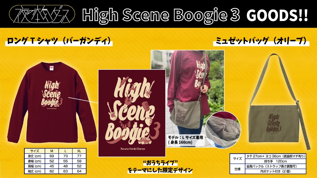 また、『High Scene Boogie 3 ~Autumn , bell & deer from Live House~』では、本ライブ限定デザインのオリジナルミュセットバッグとロングTシャツ付きのチケットも販売。“おうちライブ”をテーマにした限定デザインとなるので、お申し込みはお早めに。