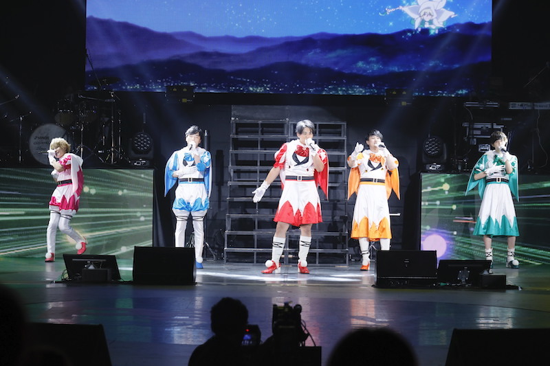 続いて登場したのはTVアニメ『美男高校地球防衛部HAPPY KISS!』の声優ユニット・地球防衛部HKの5人(下鶴直幸、小俣凌雅、石井孝英、安田陸矢、葉山翔太)。作中と同じ変身コスチューム姿でOP主題歌「絶対最幸☆HAPPY KISS☆」と劇中歌「HAPPY READY?????」を熱唱。フレッシュさと可愛らしさ全開のパフォーマンスで、会場にHAPPYを振りまいた。