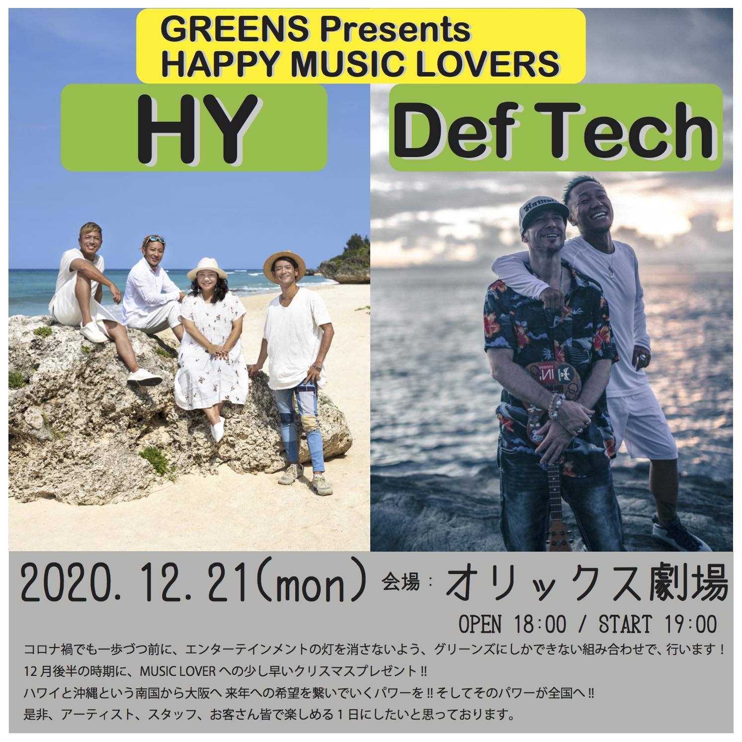 12月21日(月)、大阪・オリックス劇場にて『GREENS presents HAPPY MUSIC LOVERS』が開催される。出演はHY、Def Techの2組。