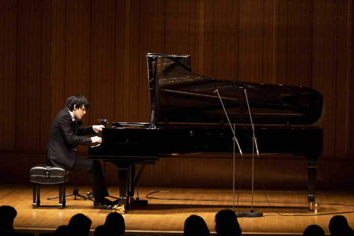 集中力の切れない70分のステージの締めくくりは、アンコール曲のリスト。しっとりと繊細な歌心に満ちた「ラ・カンパネラ」であった。クライマックスはバスの重要音を轟かせ、最後までエレガントかつスリリングに展開した。