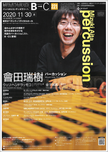 Mizuki Aita, percussion 1988年宮城県仙台市出身。宮城県仙台第二高等学校を経て武蔵野音楽大学、および同大学院修士課程修了。佐々木祥、星律子、吉原すみれ、神谷百子、有賀誠門、藤本隆文の各氏に師事。日本現代音楽協会主催第9回現代音楽演奏コンクール「競楽Ⅸ」において第2位入賞。2016年NHK-BSプレミアム『クラシック倶楽部』出演。これまでに3枚のアルバム『with…』(朝日新聞推薦盤)『ヴィブラフォンのあるところ』(レコード芸術特選盤)『五線紙上の恋人』(レコード芸術準特選盤)を発表し、いずれも高い評価を得た。