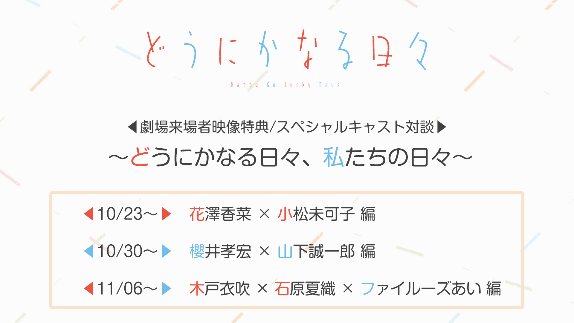 志村貴子のオムニバス漫画 (太田出版刊)を原作とした、劇場アニメ『どうにかなる日々』が10月23日(金)に公開されるが、来場者特典として、本編上映前に劇場映像特典「スペシャルキャスト対談~どうにかなる日々、私たちの日々~」の上映が実施されることが決定した。