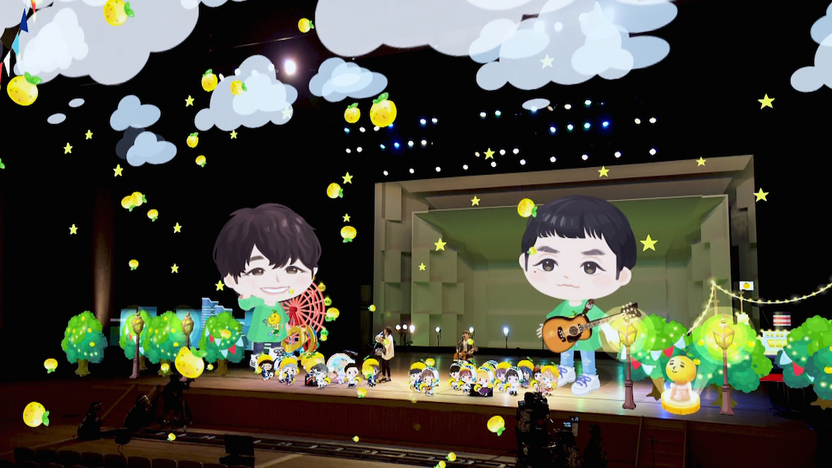 「次の曲ではなんと、タオルを使います!」(岩沢)と“AGAINタオル”を掲げながら披露されたのは、「陽はまた昇る」(シングル/2005年)。<暗闇の向こう側に 差し込む光へ手を伸ばそう>というサビに合わせて、タオルを上に向かって投げるイラストが画面に映し出される。北川、岩沢は客席を移動しながら歌い、すぐそばに観客がいるかのような一体感を生み出していた。そして「夏色」(シングル/1998年)では「もっと近くに来い!」(北川)とオーディエンスを煽り、「それ!それ!それ!それ!」の掛け声とともに心地よい高揚感へとつなげる。曲の終盤では“ピグゆず”も登場。同じくピグで参加の24名のファンとともにステージを盛り上げた。