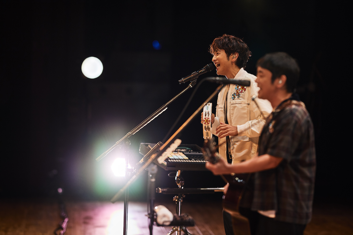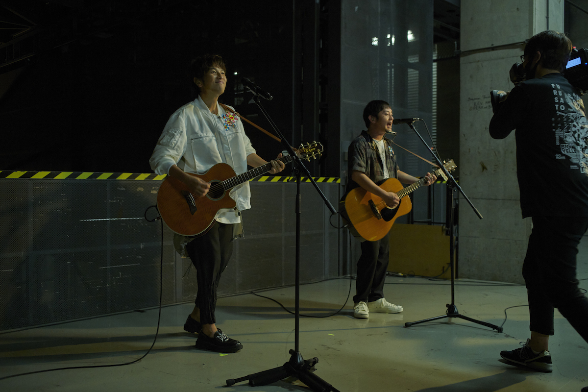 ライブ中盤では、10月14日に44才の誕生日を迎えた岩沢へのサプライズも。ケーキを持って「Happy Brithday」を歌う北川とライブスタッフ、少し照れたような笑顔で「ありがとうございます!」と答える岩沢からは、チーム全体の温かい一体感が感じられた。ステージの下にある“奈落”で披露されたのは、インディーズ時代の楽曲「地下街」(ミニアルバム『ゆずの素』/1997年)。<誰の心の中にも 花は咲くから>いう歌詞が沁みる、フォーキーな手触りの楽曲だ。この曲で北川は、生まれて初めて買ったというタカミネギターのアコギを使用。二人が演奏している楽器を“間近”で見られるのも、オンラインライブならではの楽しみだ。