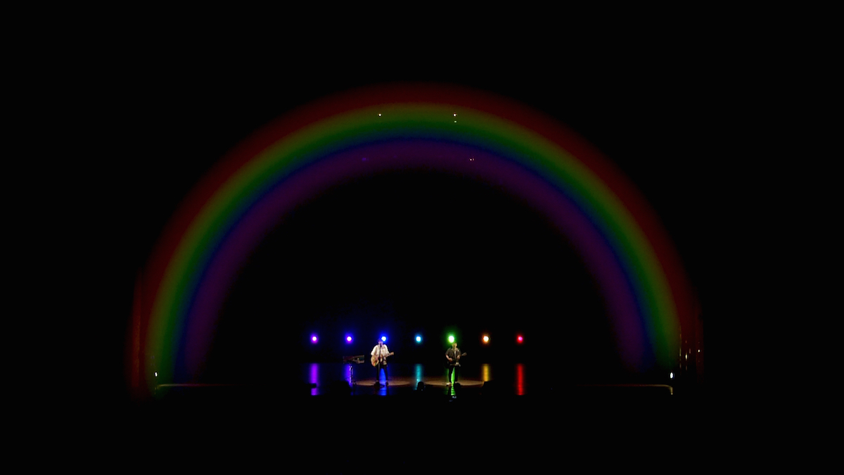 北川の鍵盤ハーモニカの音色、岩沢厚治の叙情豊かなボーカルが響き合う「灰皿の上から」(アルバム『ゆずえん』収録/1999年)の後は、代表曲の一つ「虹」(シングル/2009年)。虹の絵が描かれた北川のアコギから始まり、ストリングス、バンドサウンドの音を重ねながら、<越えて 越えて 越えて>という力強いサビが響き、ライブは早くも最初のピークへ。<雨上がりの空に そっと架かる虹の橋>という最後のフレーズに合わせ、画面にはARによる美しい虹が映し出された。