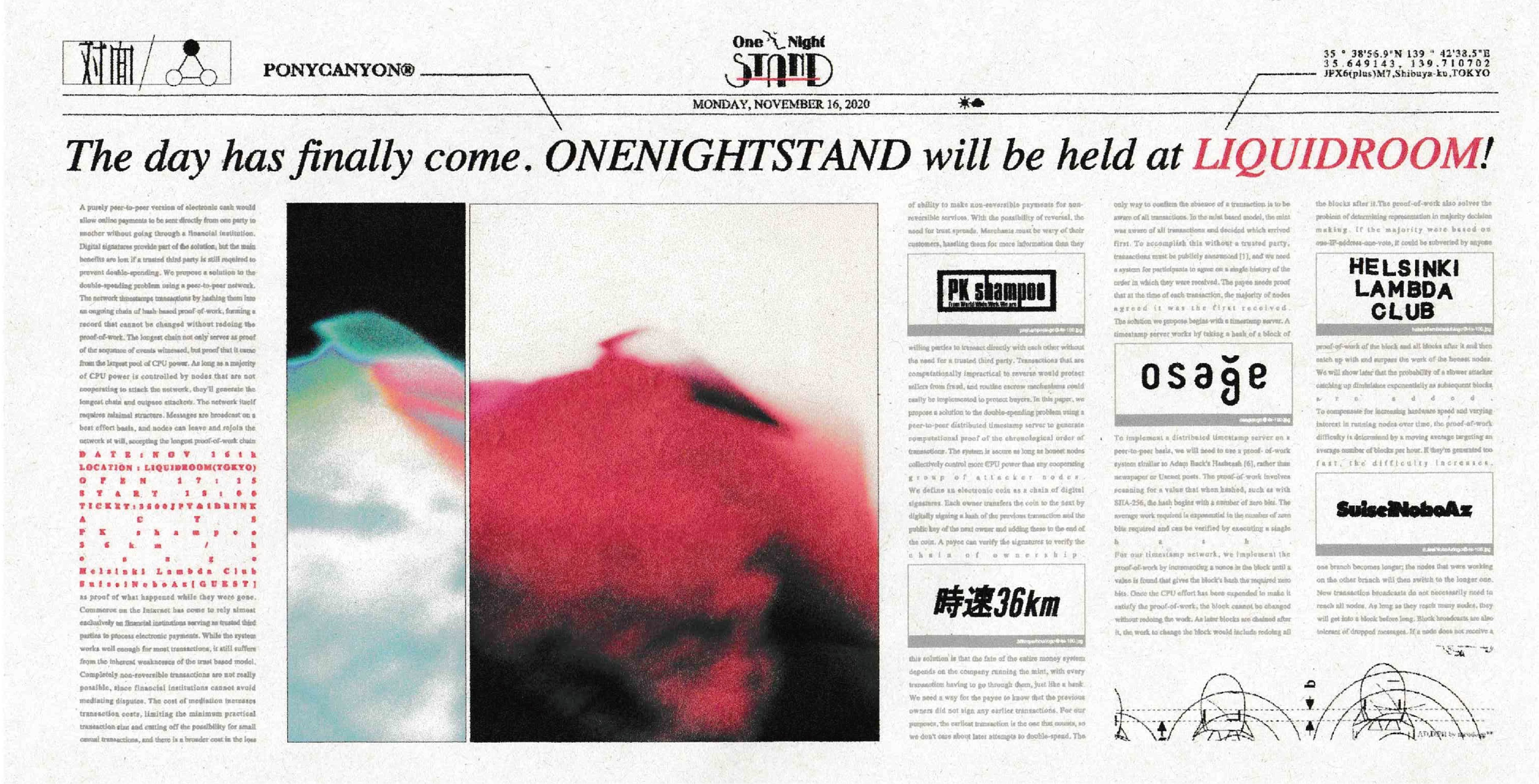 2019年3月よりスタートしたポニーキャニオン主催ライヴイベント『One Night STAND』再始動となるこのイベント。出演アーティストは、今年2月に渋谷 CLUB QUATTROで開催された『One Night STAND -EXTRA-』出演のPK shampoo、時速36kmをはじめ、osage、Helsinki Lambda Club、更にゲストアクトとしてSuiseiNoboAzの出演も発表された。