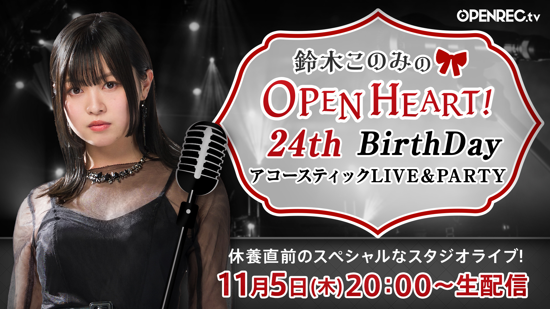 11月5日(木) 、鈴木このみ24歳の誕生日に『鈴木このみのOPEN HEART!presents 24thバースデーアコースティックLIVE&PARTY』の開催が決定した。
