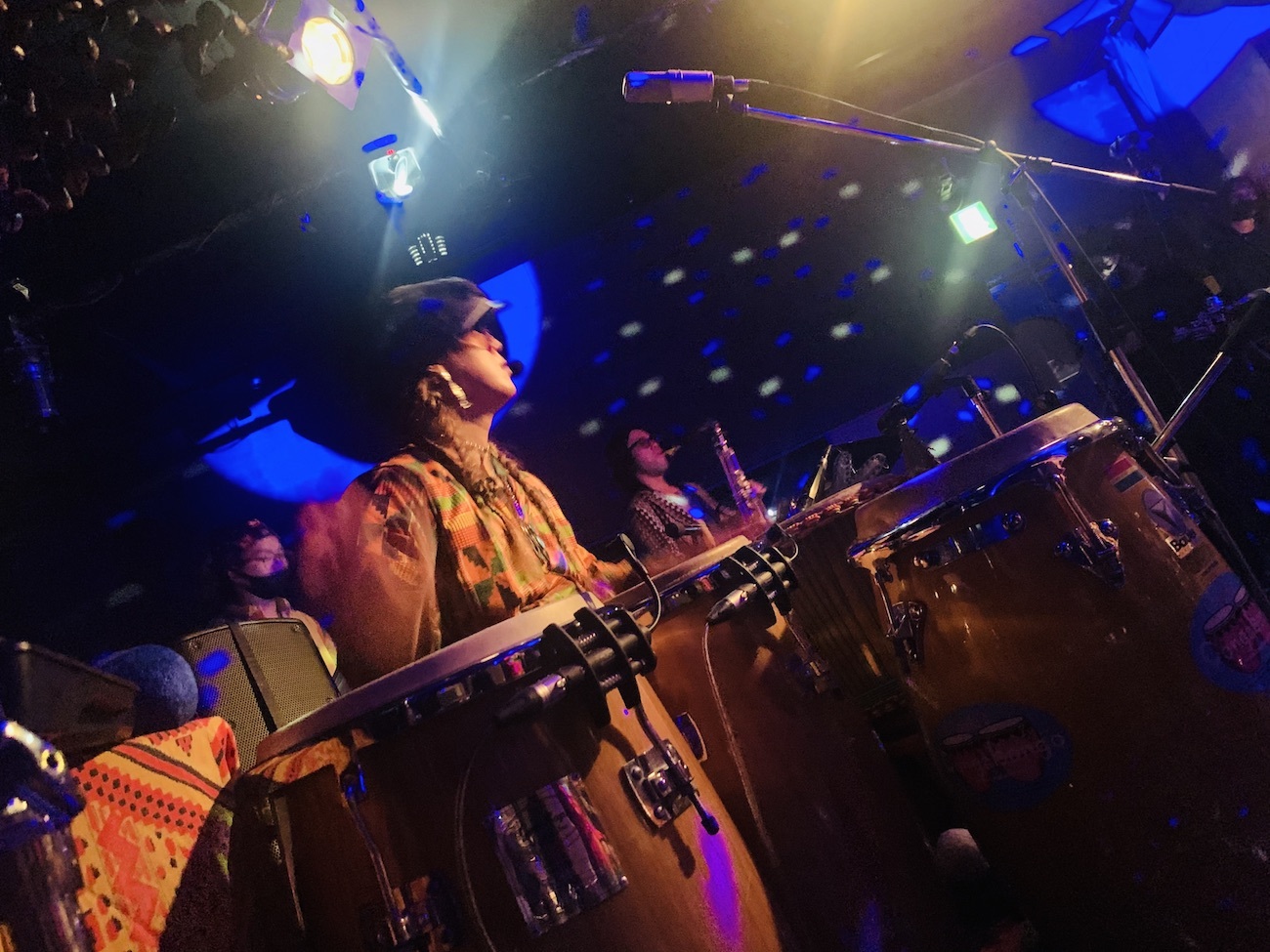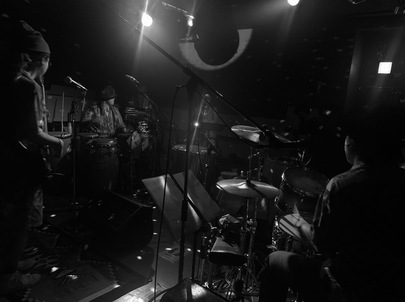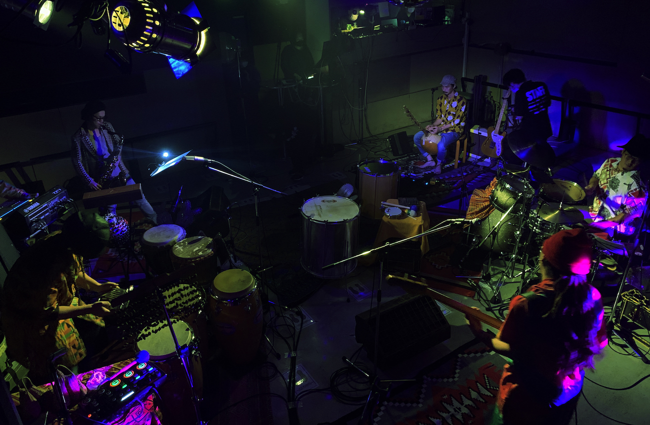 会場となった大塚Deepa、画面越しに見るファンたちの間に、どんなライブが繰り広げられるのかといった緊張感が漂う中でパーカッション、Yui Arakawaが登場。独奏でジャンベやコンガなど様々な楽器で音を奏で始める。この瞬間にYui Arakawa初となる配信ライブの幕が開けた。その後ルーパーを多用しリズムを作りだし、フロアの中央へ移動していく。ムビラを手に待ち構えていたDr白根佳尚とのセッションが始まる。2人は時折顔を合わせながら、ムビラで優しい音色を奏でていく。その後もスルド等ブラジル楽器を演奏しながら世界観を丁寧に作り上げていく。