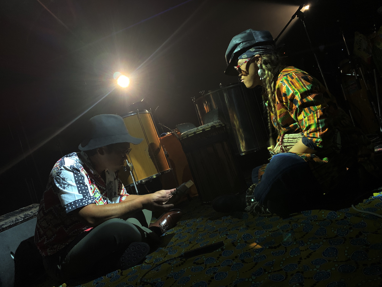 ブラジルの弦楽器ビリンバウ(Yui Arakawa)と、ドラム(白根佳尚)、そこへベーシストのYahmanが加わり重低音が会場の楽器を揺らし始めた。ゲストの兒玉峻が西アフリカの弦楽器カメレンゴニで、鬼塚康輔がサックスで演奏に加わると、YUI&The Mahadhi Bohemiansの世界感により一層の色彩が加わり会場、配信先の空間を染め上げていった。