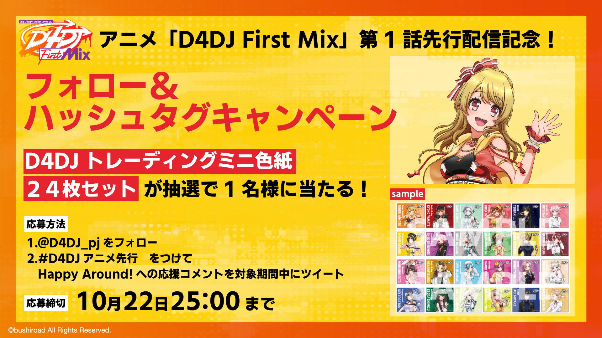 アニメ第1話先行配信を記念して、D4DJ公式Twitterでフォロー&ハッシュタグキャンペーンが開催されている。抽選で1名に、D4DJトレーディングミニ色紙24枚セットをプレゼントする。