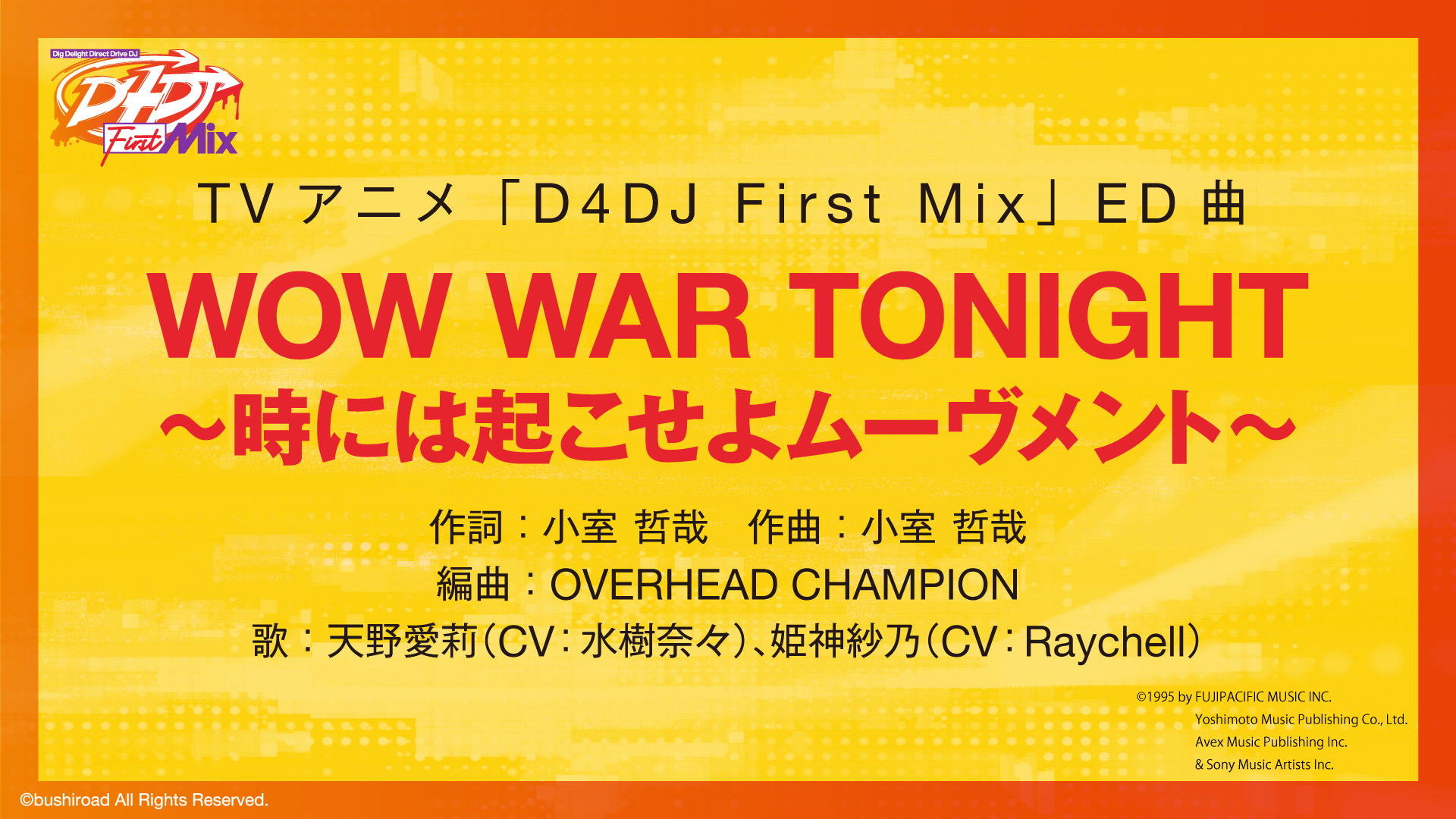 10月30日(金)放送開始のTVアニメ『D4DJ First Mix』のエンディング曲が「WOW WAR TONIGHT ~時には起こせよムーヴメント~」であることが発表された。 歌うのは天野愛莉役 水樹奈々と姫神紗乃役 Raychellの二人というのも驚きだ。