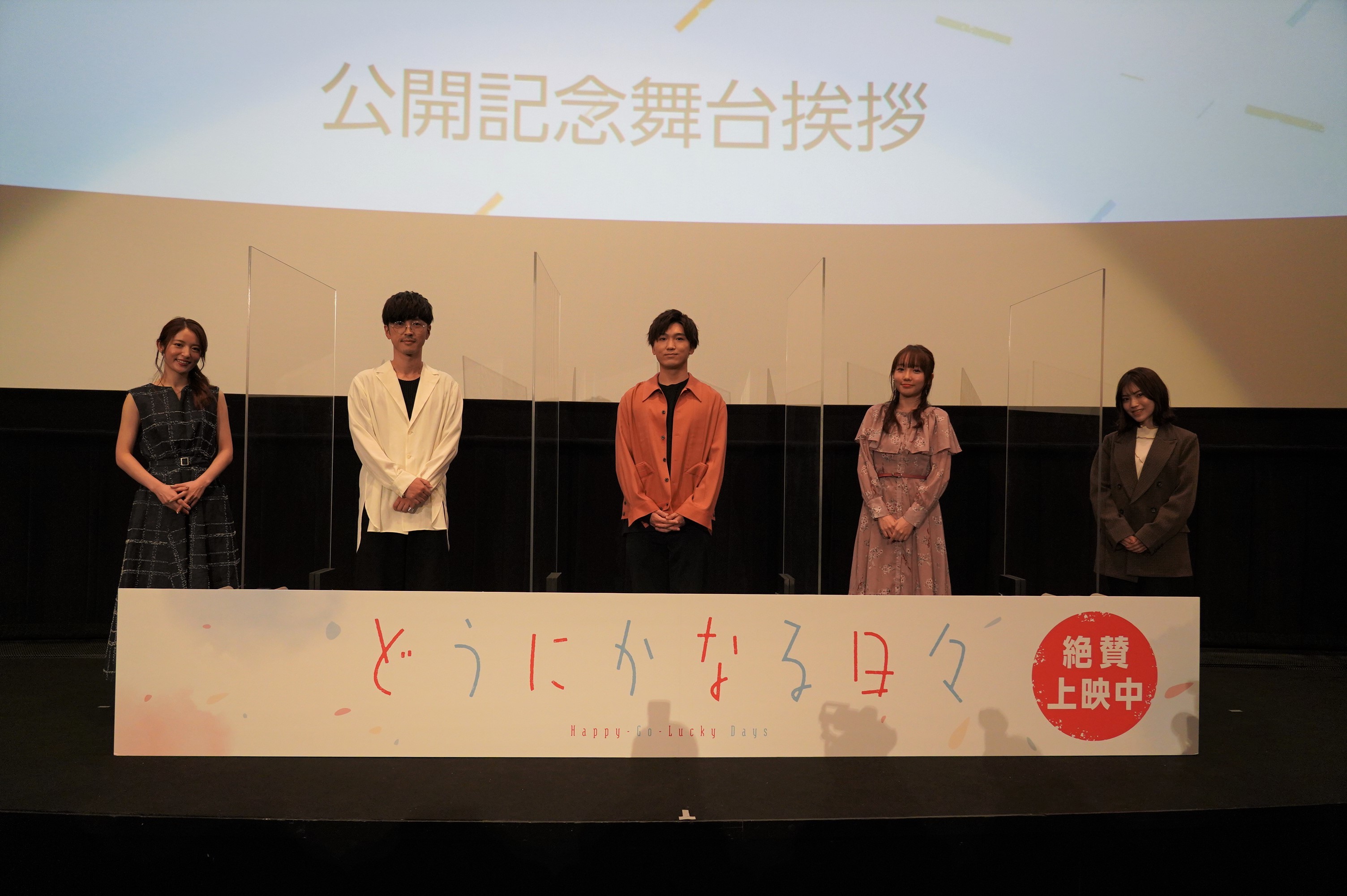 冒頭の挨拶で、小松は「ようやく公開できることをうれしく思います。お客様が入っての舞台挨拶は 1 億年ぶりじゃないかなと思ってしまうほど、久しぶりな感じがしています。今日はどうぞよろしくお願いいたします」と満面の笑みを浮かべる。櫻井は「この回に駆けつけていただいて本当にありがとうございます。短い時間ですが、楽しくおしゃべりしていきたいと思います。よろしくお願いいたします」と会場を見渡し、ニッコリ。山下は「みなさんと一緒に『どうにかなる日々』の感動を分かち合いたいと思います」と笑顔で挨拶。木戸が「みなさんこんにちはー!」と会場に向かって手を振ると、場内は大きな拍手に包まれる。続けて「皆さんに観てもらってはじめて映画は完成するものと思っています。今日はどうぞよろしくお願いいたします」と微笑んだ。石原は「この日を迎えられたことを本当にうれしく思います。どうぞよろしくおねがいいたします」と手を振りながら挨拶をした。