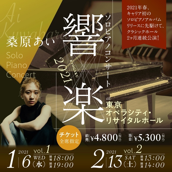 2021年1月6日(水)・2月13日(土)に、ジャズピアニスト桑原あいのソロ・ピアノ・コンサート『響楽-KYOGAKU-2021』が東京オペラシティにて開催されることが決定した。