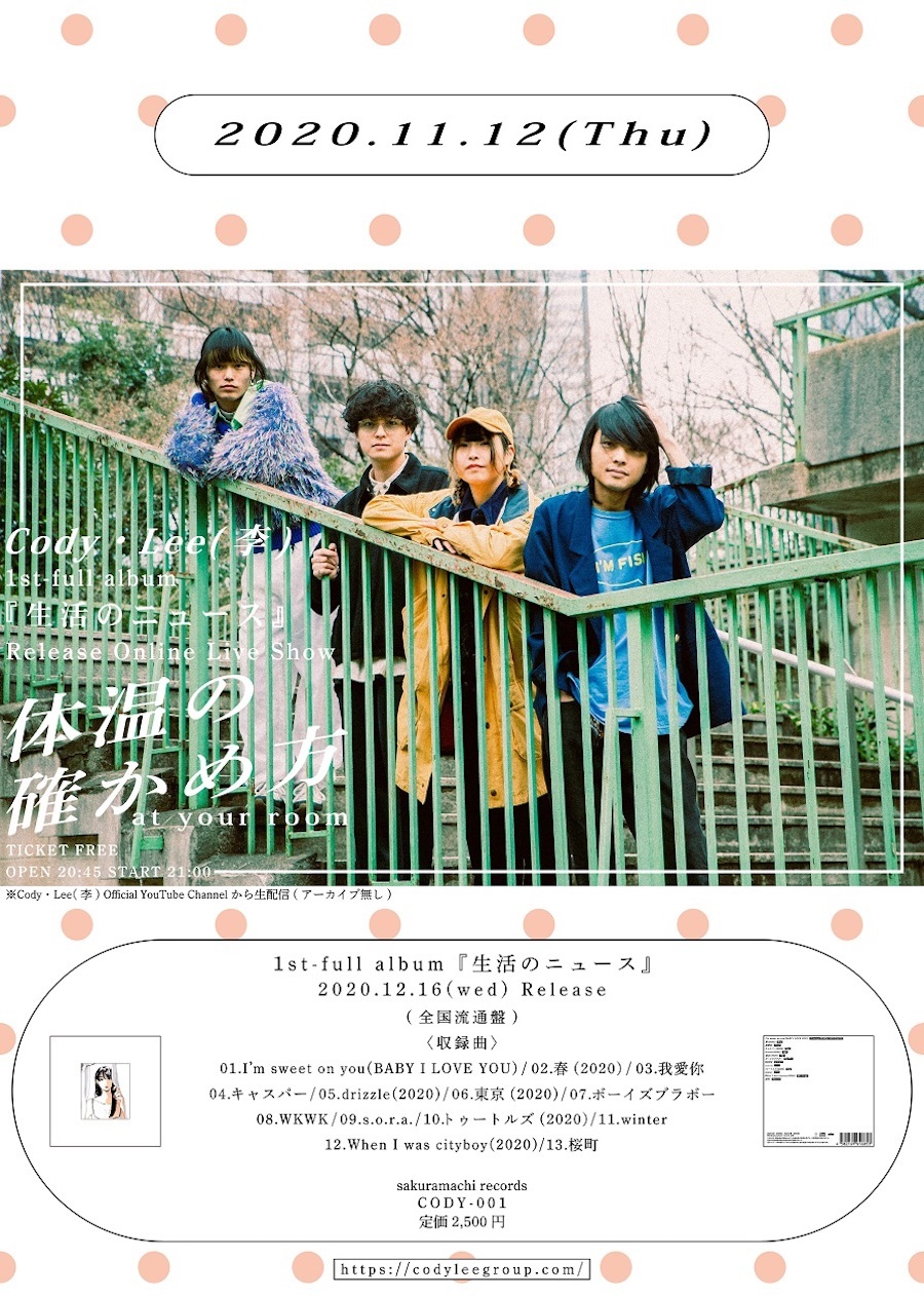また、初のアルバムリリースを記念し、無料生配信ワンマンライブ『体温の確かめ方 at your room』の開催も決定した。“あなたの部屋から好きな様に楽しんでほしい”というメンバーの想いが詰まった本公演は、11月12日(木)20:30よりCody・Lee(李)のオフィシャルYoutubeチャンネルより生配信。本編終了後にも、“何か”が用意されているとアナウンスされている。