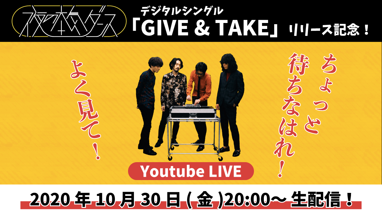 夜の本気ダンスが10月30日より配信するデジタルシングル「GIVE & TAKE」のリリースを記念して、同日20時より自身のYouTubeチャンネルにて生配信『ちょっと待ちなはれ!よく見て!YouTube LIVE』を実施することを発表した。