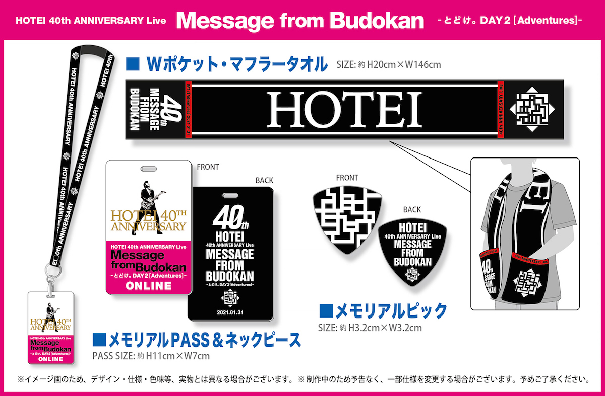 グッズの内容は「メモリアルPASS&ネックピース」「Wポケット・マフラータオル」「メモリアルピック」の3アイテムで、武道館公演のグッズ付きチケットのアイテムと同じ仕様になっており、初日、二日目それぞれのイメージカラーで製作予定。グッズは公演当日までに申込者に届くので、配信ライブ当日はグッズと共に公演を楽める。