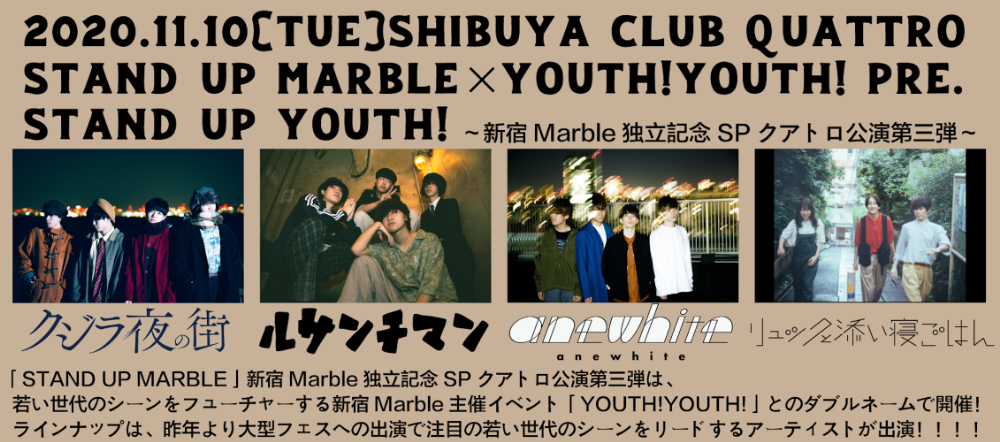 11月10日(火)に渋谷クラブクアトロで行われる、「STAND UP MARBLE×YOUTH!YOUTH! pre.『STAND UP YOUTH!』~新宿Marble独立記念SPクアトロ公演第三弾~」に出演するアーティストが発表となった。