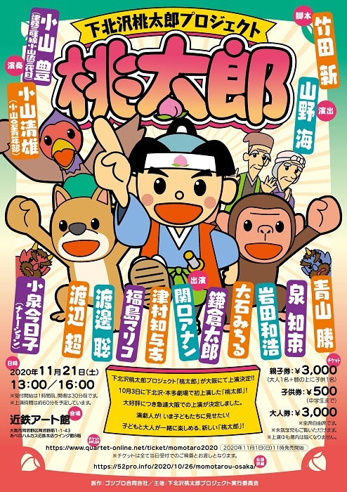 2020年11月21日(土)大阪・近鉄アート館にて、下北沢桃太郎プロジェクト『桃太郎』大阪公演の開催が決定した。舞台を中心に活躍する演劇人が集まり、劇場で子供たちと一緒に楽しめる演劇を届ける。