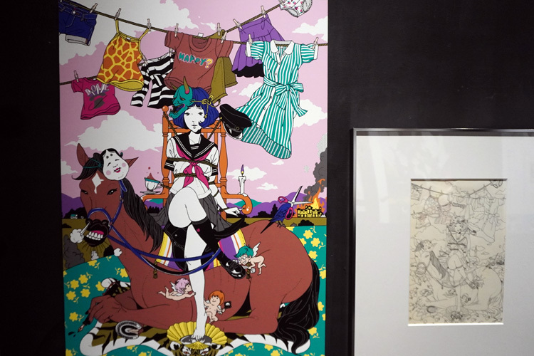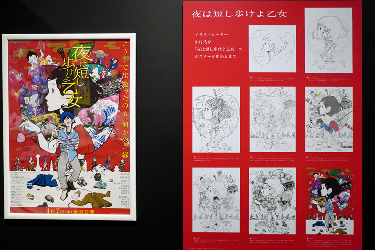『夜は短し歩けよ乙女』のポスターができるまでの過程は、たくさんのアイデアや試行錯誤、没になったバージョンが存在することを示す。最初のラフスケッチから最後の完成形を見ると、作業工程の細かさと豊富なアイデアに感動を覚える。本展ではアイデアスケッチや着色する前の原画など、制作過程を示す絵がたくさんあるので、イラストレーターを目指す人にとっても参考になるはずだ。