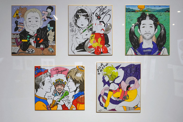 上段左より:和田誠、あきまん(安田朗/共作)、会田誠 下段左より:ビックリマン(グリーンハウス・米澤稔&兵藤聡司/共作)、桂正和(いずれもイラスト誌『季刊エス』連載 “シゴトバ探訪”色紙)