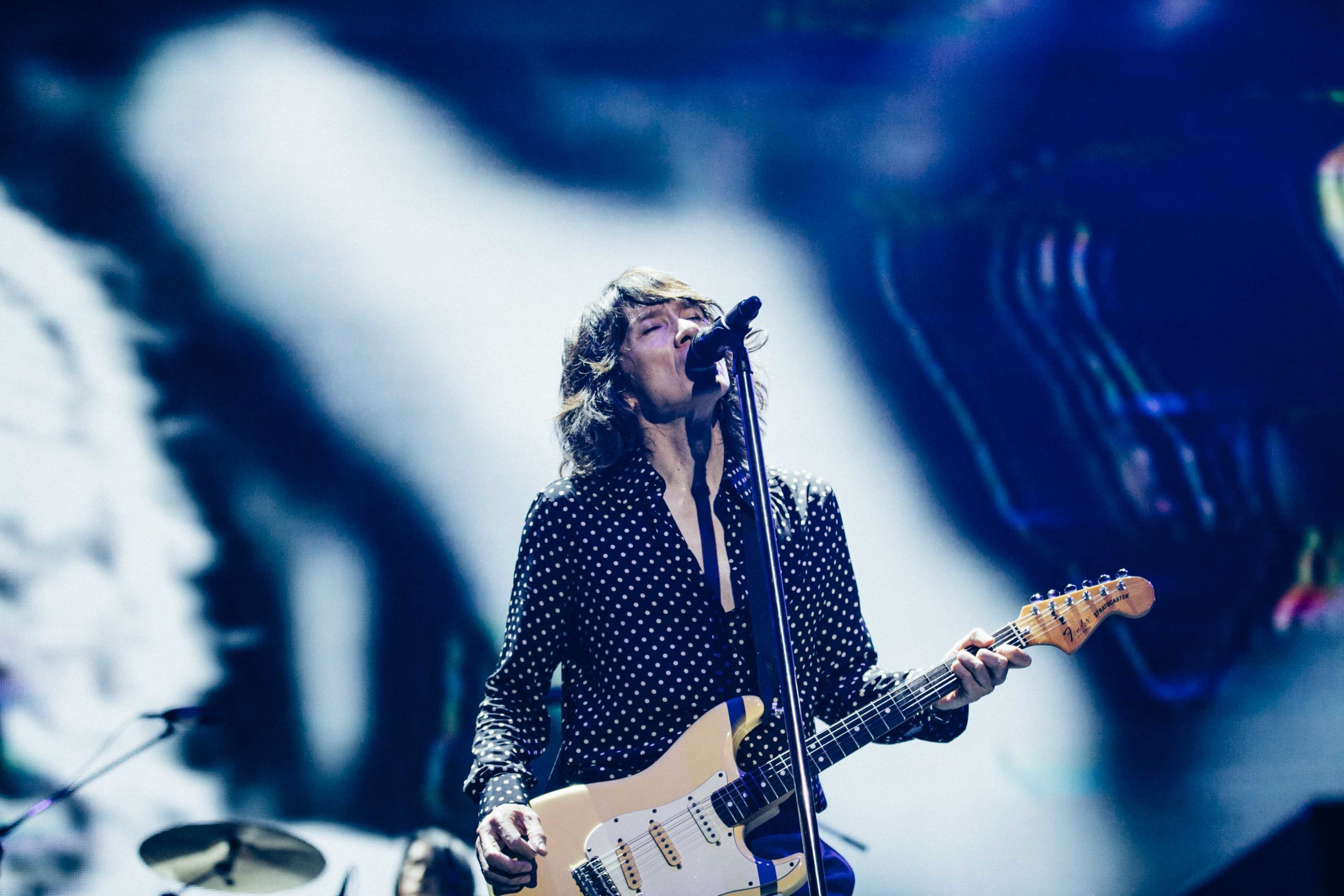 演奏が一息つくと、会場は長い拍手で包まれる。横浜アリーナという会場が、90年代後半にバンドがロンドンでレコーディングを行なっていた思い出とも密接なつながりがある場所であることをMCで語った吉井。「(当時の)淡い切ない空気感を感じていただけたらいいなと思っています」と伝えると、「NAI」のエバーグリーンなサウンドが会場を優しく包み込んだ。中盤には、エマとヒーセがステージから伸びた左右の花道へと広がり、吉井が宇宙空間を遊泳するようなパフォーマンスを見せた「HOTEL宇宙船」、両手を大きく振って盛り上がった「SHOCK HEARTS」で会場が一体になった。吉井が激しくギターをかき鳴らしたイントが口火を切り、圧倒的な混沌を作り上げた「天国旅行」は、この日のハイライトのひとつだった。