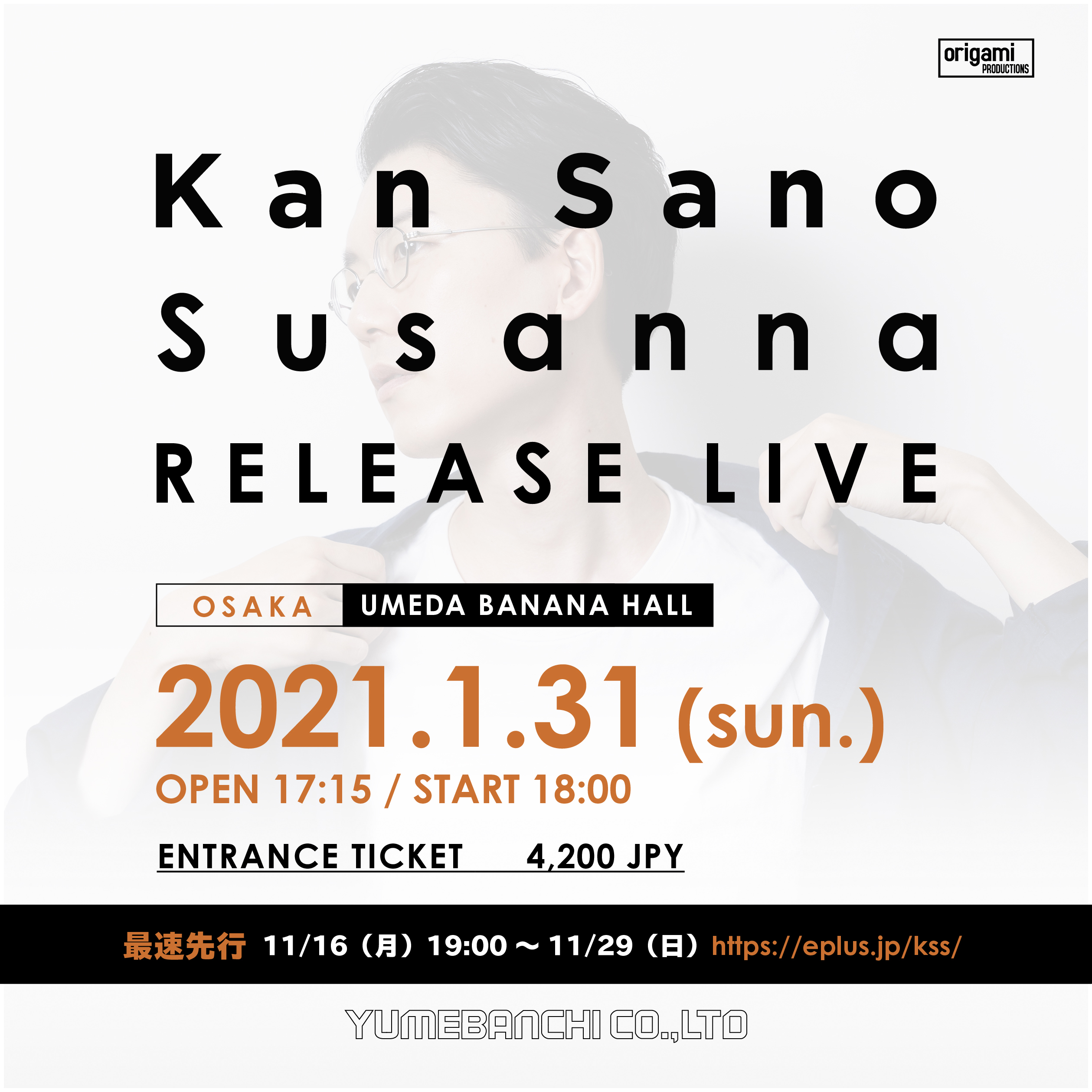 Kan Sanoが11月25日(水)発売のニューアルバム『Susanna』のリリースを記念して、2020年12月17日(木)渋谷 WWW X、2021年1月31日(日)梅田 Banana Hallにて『Kan Sano "Susanna" Release Live TOKYO + OSAKA』が開催される。