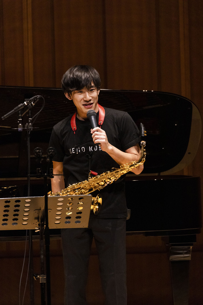 前半のラストに演奏した「ファジーバード・ソナタ」は、上野が師事した須川展也のために吉松隆が書き下ろしたもの。「僕が生まれる1年前(1991年)にできたんです。第1楽章 はRun,Bird、第2楽章はSing,Bird、最後はFly,birdからなる曲で、いろいろな場面が想像できます」と説明。ポルタメントやさまざまなタンギングを駆使した表現は、時間や場所を越えていく。