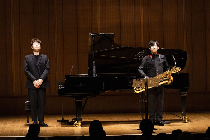 回転するようなリズムと変拍子、美しいメロディーで魅了した二人。「サクソフォンの千倍ぐらい音数があって、とても難しい」と演奏を振り返った山中は、「クレストンはピアノを弾けなかったんじゃないかと思うくらい、無理ばかり書いてある」とこぼし、観客を笑わせた。