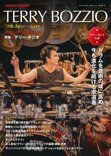 そんな彼が70歳を迎えるにあたり、本人公認の下にそのキャリアを集成した究極のテリー・ボジオ本『レジェンダリー・ドラマー 特集●テリー・ボジオ』が12月21日に発売されることとなった。60年超に及ぶ音楽活動を辿った新取りインタビュー、要塞ドラム・セットの詳解、ディスコグラフィ、娘Marina(ALDIOUS)や公認ドラム・テクニシャンの枝川氏などの関係者インタビュー等、“偉大なる求道者“テリー・ボジオの功績を1冊に集約した内容となっている。
