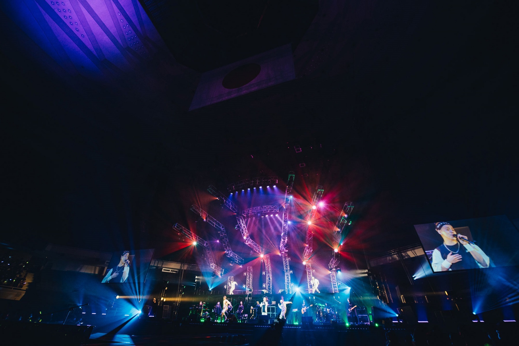今か今かと開演を待ちわびるファンの不意をつくかのように、客席後方に突如現れた清水翔太。割れんばかりの拍手に迎えられ、静かにセンターステージに据えられたピアノに座り、ブラックミュージックからの影響が色濃いオープニングナンバー「Feel Good」がスタート。「会場に来てくれているみんな、配信をみてくれているみんな本当にありがとう。最後まで一緒に楽しみましょう!」というメッセージを伝え、メインステージに移動。披露したのは「Impossible」「Friday」といったダンサブルな2曲だ。続く「My Boo」では、ファンに1番を歌ってもらうのが定番になっていたところを、今回のライブでは「今日は一緒に歌えないから、心の中で一緒に歌って!」と呼びかけ、自身最大のヒット曲を高らかに歌い上げる。