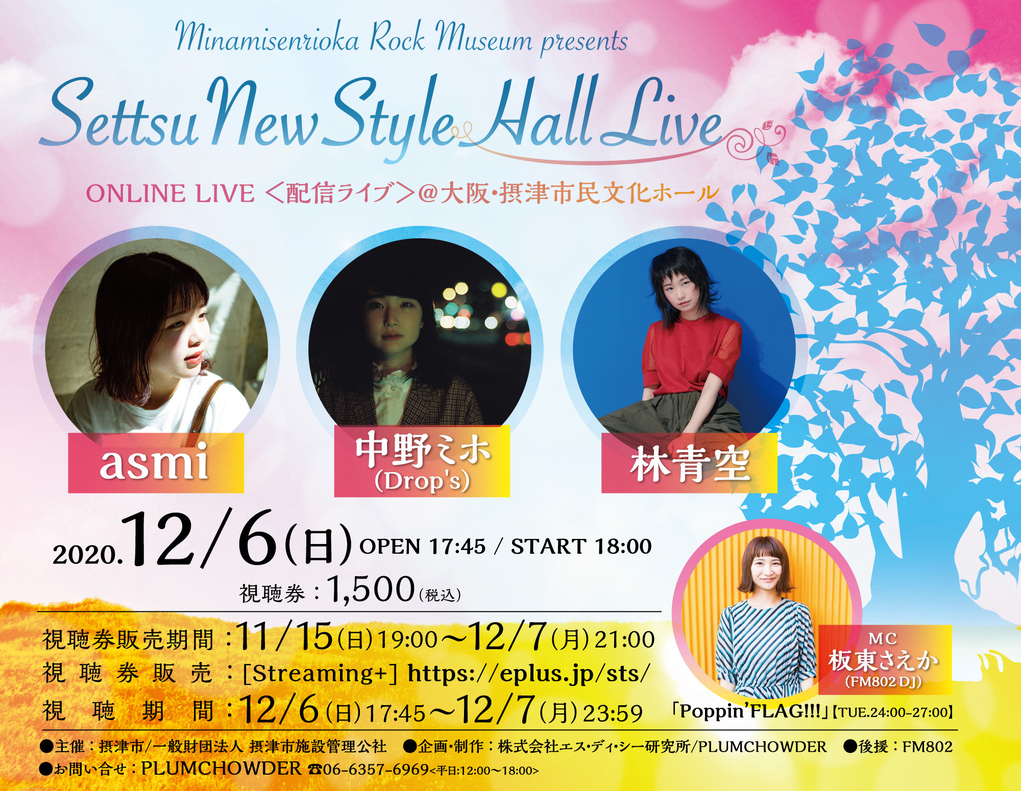 出演者はasmi、中野ミホ(Drop’s)、林青空の3組。イベントMCとして、板東さえか(FM802DJ)を迎え、収容人数、約400名のコンサートホールを舞台に、トーク&ライブを展開する内容となっている。