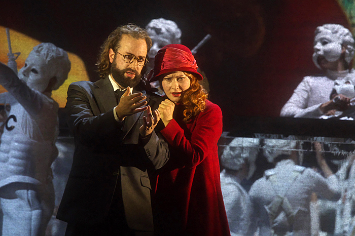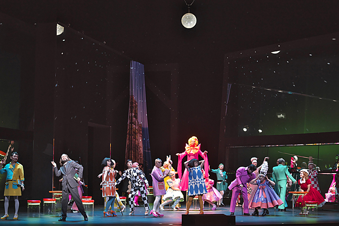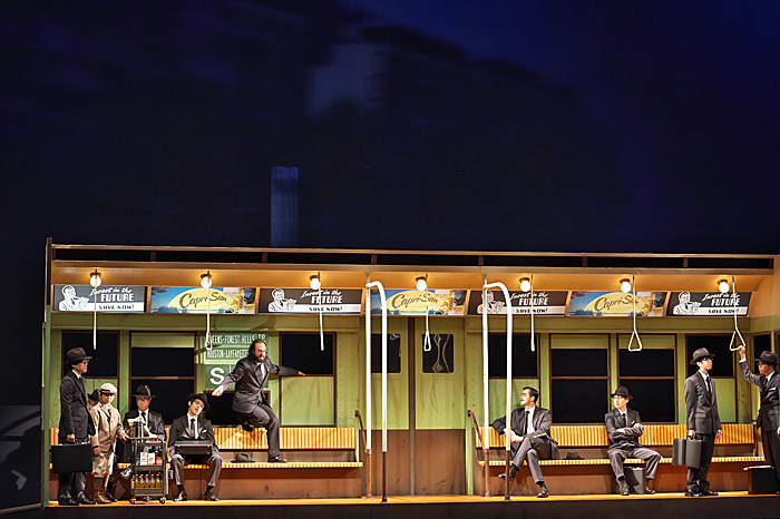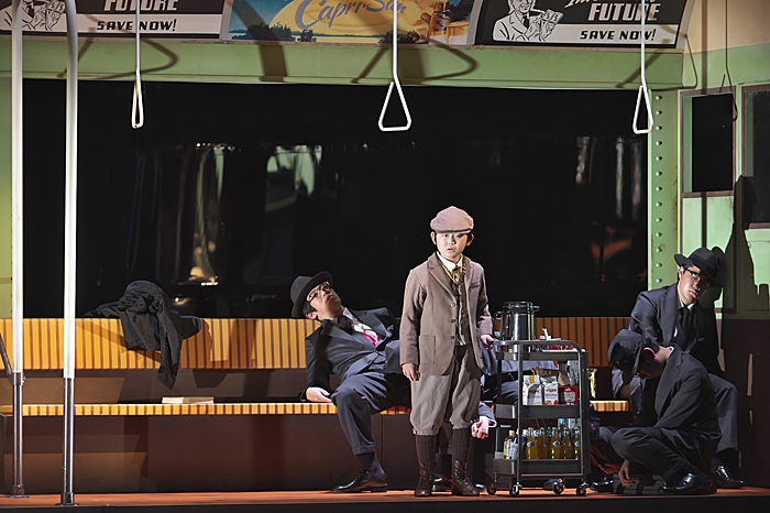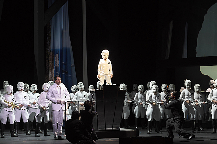 小説の中では未来として語られる夢の中の世界は、オペラでは夢を超えて現実となっていく。独裁者は、カルト集団のリーダー的な存在でもある。鏡やスクリーンを大胆に使った大がかりな装置、電車の中と夢の世界の移行はスムーズだ。