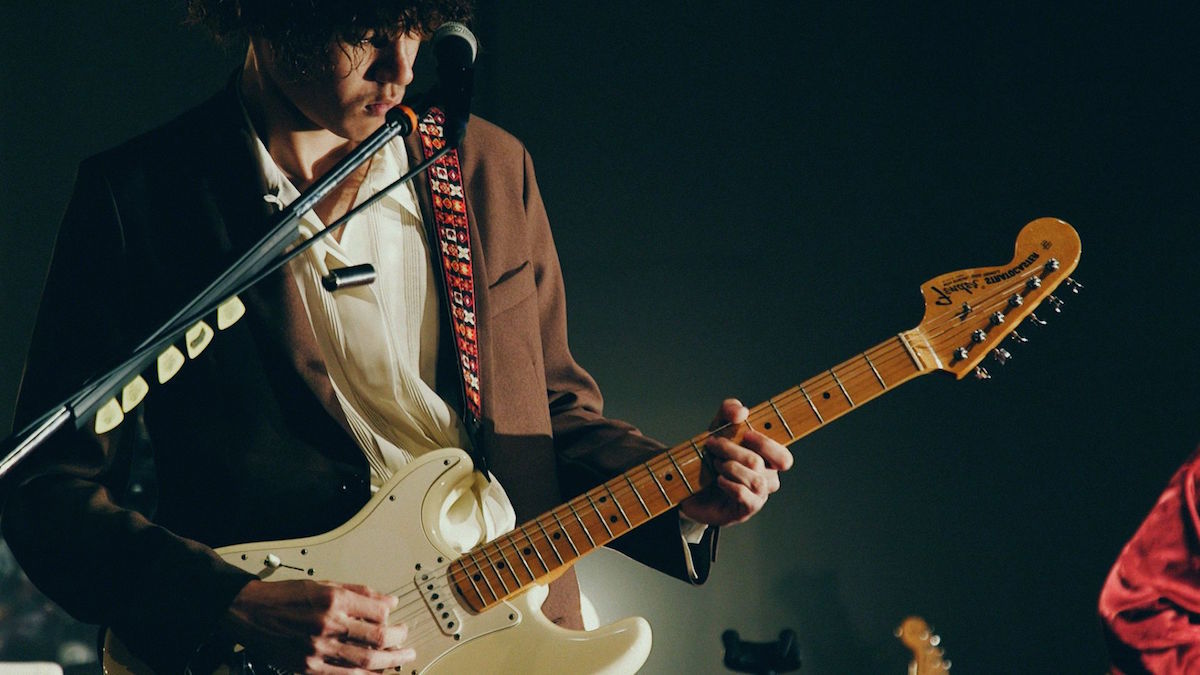 通常のライブであればまずあり得ない近い距離感とアングルでステージを捉えたモノクロの映像に静まり返る場内。亀本がシールドをギターに指す音や、ストラップを肩にかけたときに反応する弦の音などから独特の生々しい緊張感が漂う。そして始まったのはニューアルバムで冒頭を飾ったインスト曲「Intro: Walking On Fire」。おそらく多くの人がまず、その音質の良さに度肝を抜かれたのではないだろうか。音源とは当然異なる、ライブならではの空間的な音がクリアに力強く鳴り響き、凄まじい臨場感を演出する。サポートメンバーは4人。かどしゅんたろう(Dr)、栗原大(Ba)、元ゴメスこと中込陽大(Key)のお馴染みの3人に、今回初めてサポートギタリスト・竹之内一彌が加わったことで、演奏に厚みが増し、今までは基本的にギター&ボーカルだった松尾がハンドマイクで歌うセクションが増え表現の幅が広がったことはかなり大きい。松尾こだわりのビンテージファッションが頭の上から足の先までじっくりと堪能できたこともまた、ファンにとっては嬉しいポイントだ。