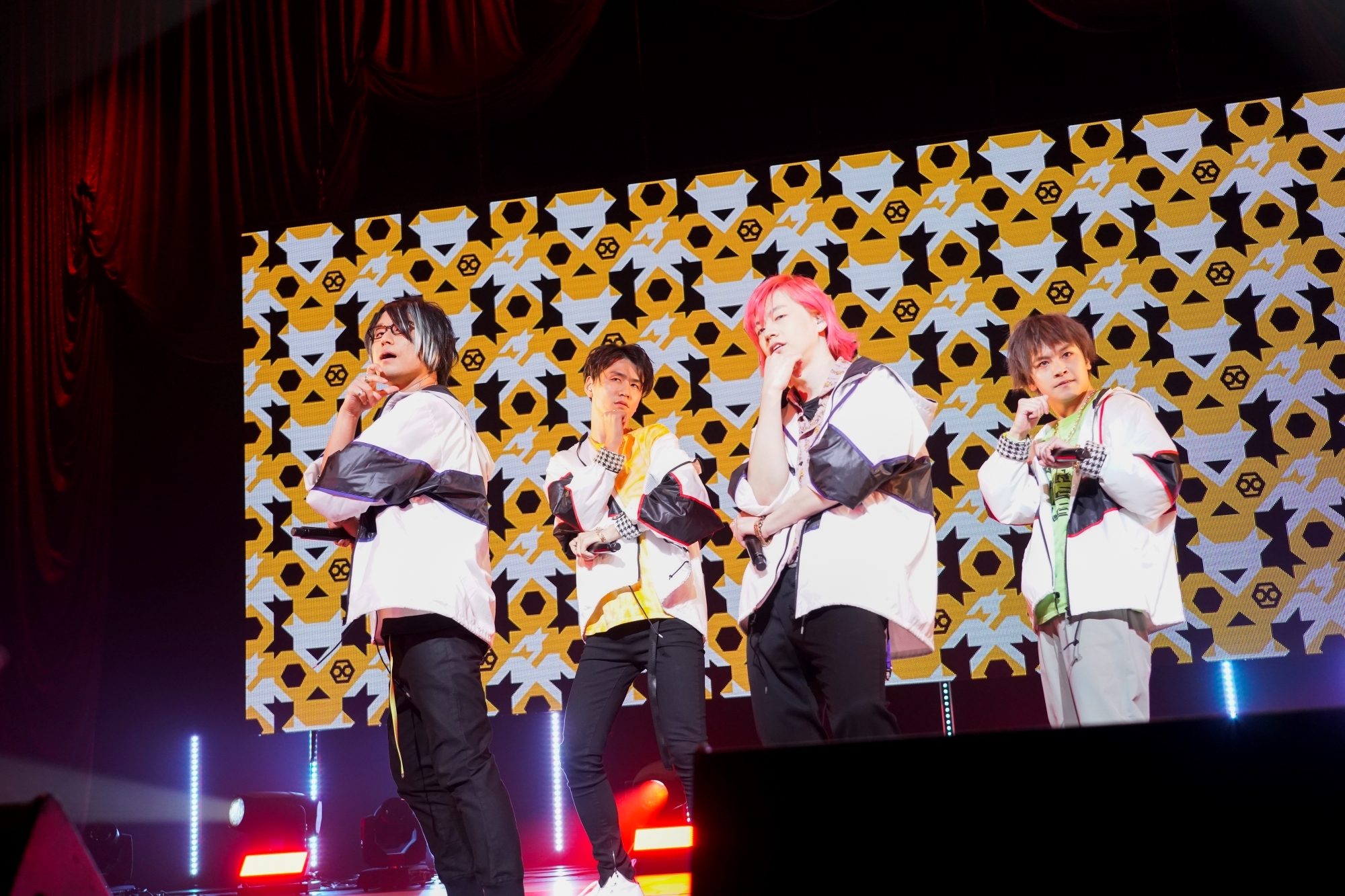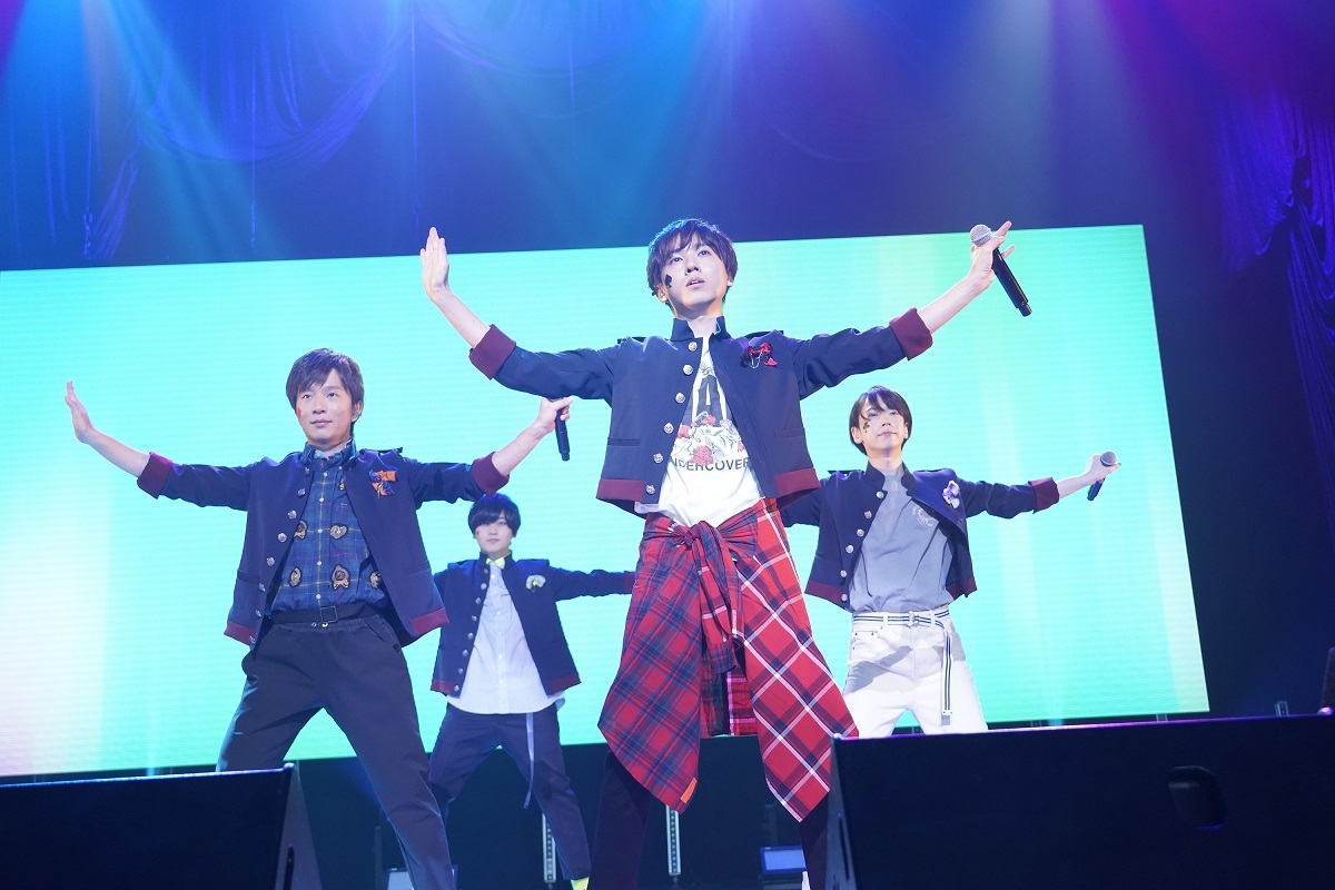 作中のキャラクター衣装と近しい雰囲気の白と黒を基調にした衣装に身を包み、エモーショナルな曲調に合わせて自由に飛び回る4人。サビの部分では思わずタオルを回したくなるほど、1曲目から会場を盛り上げていた。さすが、“ファンと一緒に盛り上がるライブ感に特化したグループ”だ。