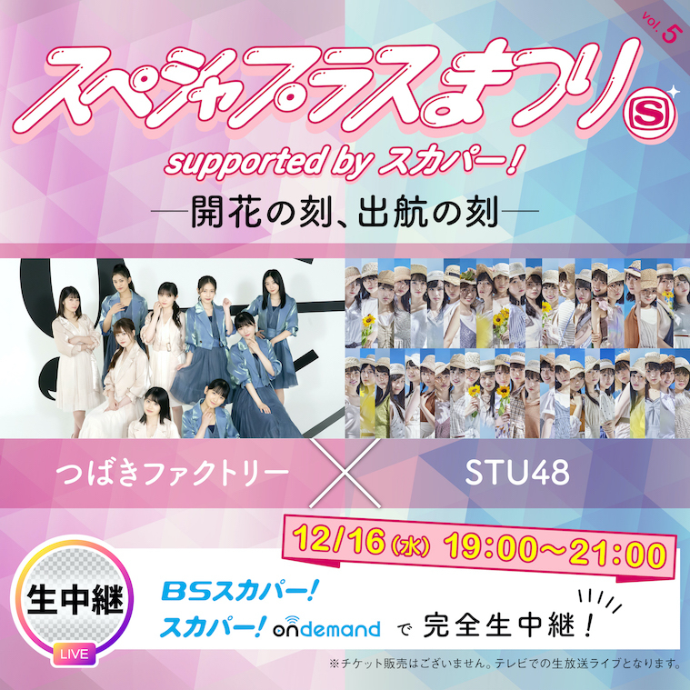 昨年に引き続き開催される本イベントは、2DAYS開催となり、初日の16日(水)はスカパー!のサポートのもと、『スペシャプラスまつり vol.5 supported byスカパー!ー開花の刻、出航の刻ー』と題し、BSスカパー!/スカパー!オンデマンドで、つばきファクトリーとSTU48のグループ単独としては初となる対バンライブを2時間生中継。ライブパフォーマンスを、今いる場所から常に最前列で堪能できる。