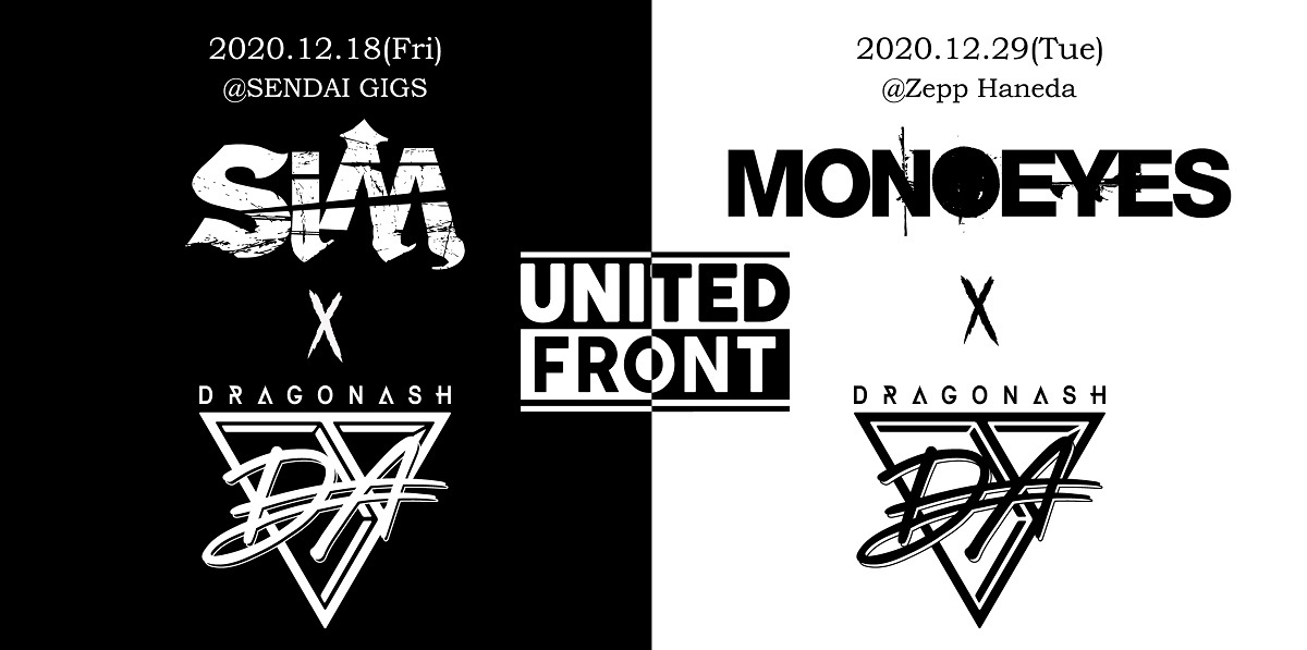 『UNITED FRONT』はDragon Ashが主催する対バンライブで、2年ぶりの開催となる今回は、『DRAGONASH LIVE TOUR 「UNITED FRONT 2020」』と題して2公演を予定。12月18日(金)仙台GIGSでSiM、12月29日(火) Zepp Haneda(TOKYO)ではMONOEYESとライブを行う。
