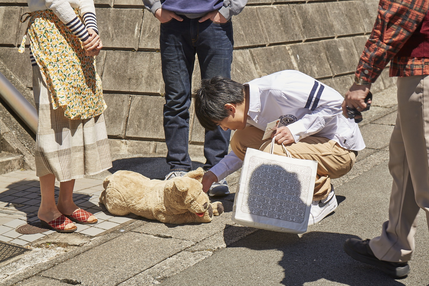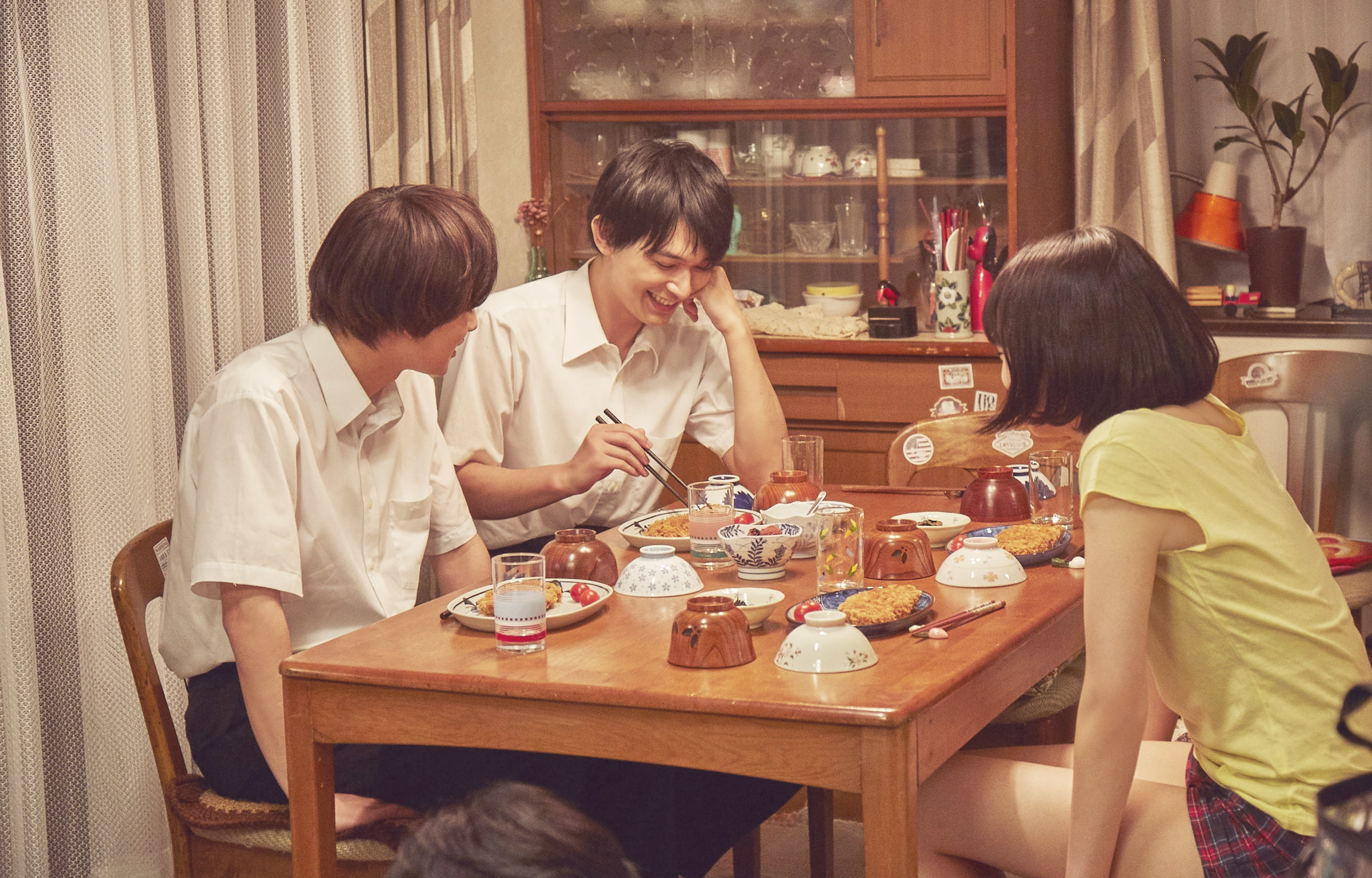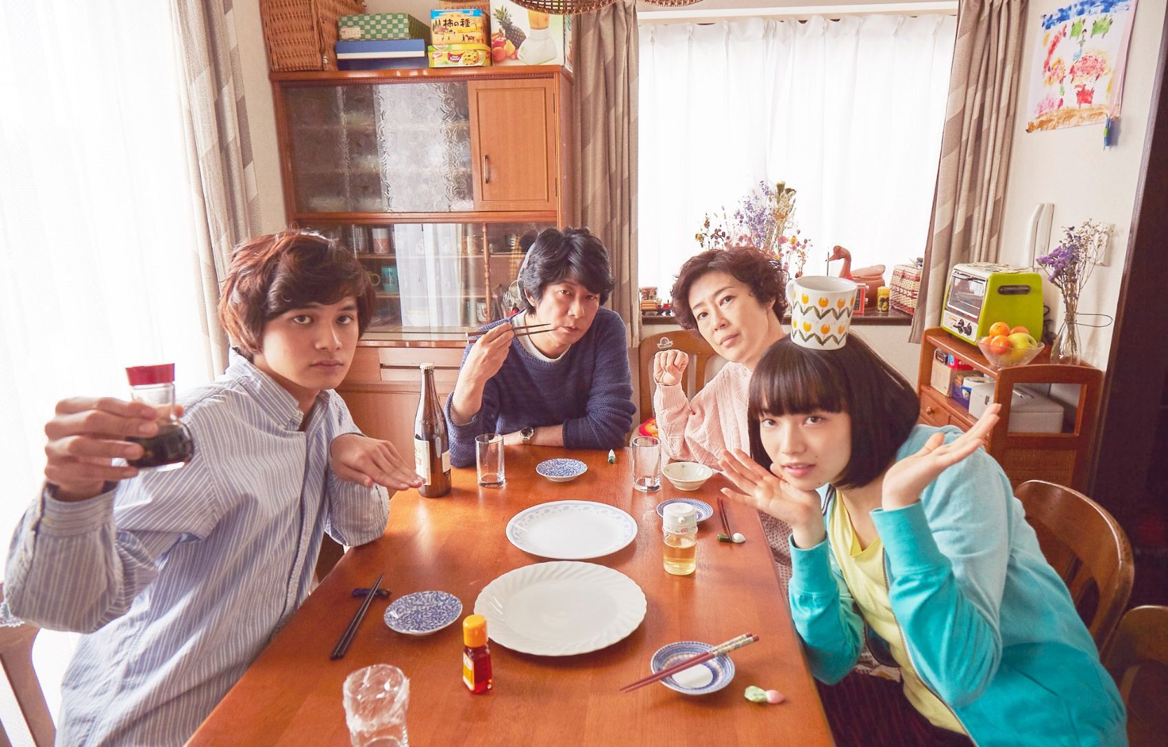 公開されたメイキングカットは、家族の食卓でふざけながらもキメポーズを取る北村・小松・寺島・永瀬ら“家族”の一幕など、撮影の合間のキャスト陣の姿を捉えたオフショット群。夕飯時の撮影中に談笑する北村・吉沢・小松のほか、クランクアップを迎えた小松・寺島・永瀬のほか、遭遇した猫を可愛がる北村や、愛犬サクラの代わりに大きな犬のぬいぐるみに向かって演技をする吉沢、撮影現場の大木に登り無邪気な表情を見せる小松の姿など、ほほえましい姿が切り取られている。