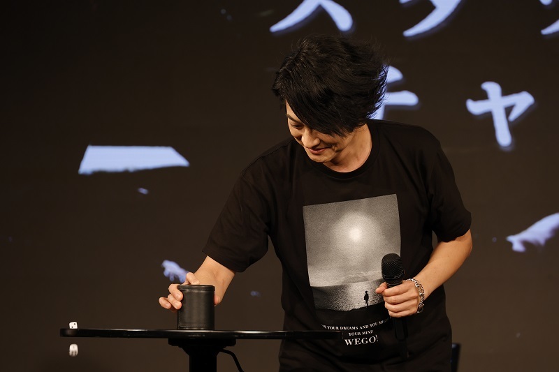 最初のゲームは「ダイススタッキング チャレンジ」。ゲームについて詳細は聞かされていない下野は「ダイススタッキング?」と首をかしげる。これはテーブルに置かれた5個のダイスをコップに入れつつ遠心力で縦に積み上げる技だが、当然初めてやる素人にできるものではない。一発目からあまりに高い難易度に、スタッフの思惑が透けて見えてくるようだが、それでも果敢にチャレンジするのが下野紘という男。とは言え開始数秒で失敗し、泣きのもう一回でも即失敗するなど、現実は無情だ。