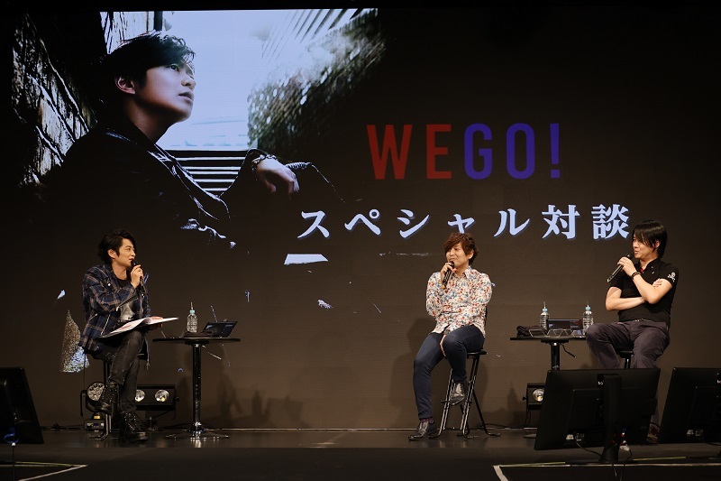 OPトークが終わると猪股はいったん退場し、ここからはゲストを迎えてのトークコーナー「WE GO! スペシャル対談」へ。ゲストは下野のアーティスト活動をデビュー時から支え続けている作詞家・RUCCAと作曲家・高橋諒のおふたり。