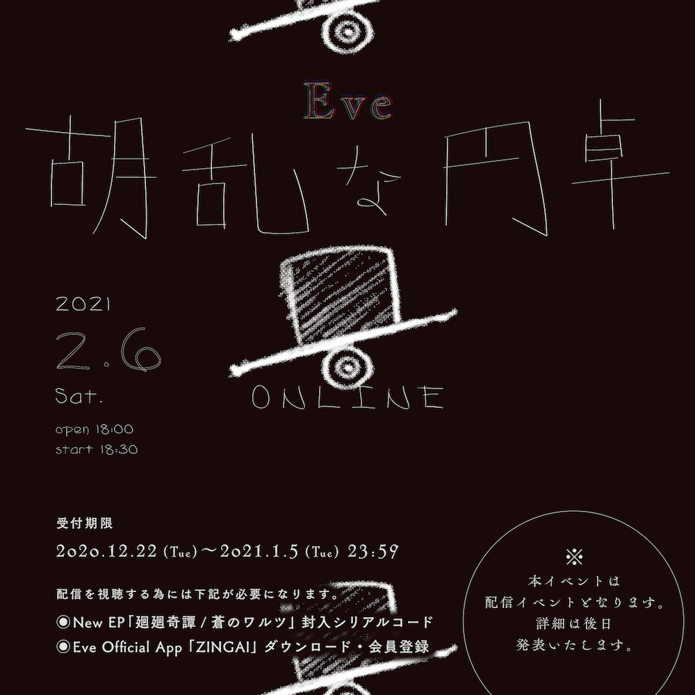 このオンラインイベント『胡乱な円卓』は、12月23日(水)に発売する『廻廻奇譚 / 蒼のワルツ』EPに封入されたチラシに入ったシリアルコードを入手し、Eve公式アプリ「ZINGAI」をダウンロード・会員登録した人のみ観ることができる。