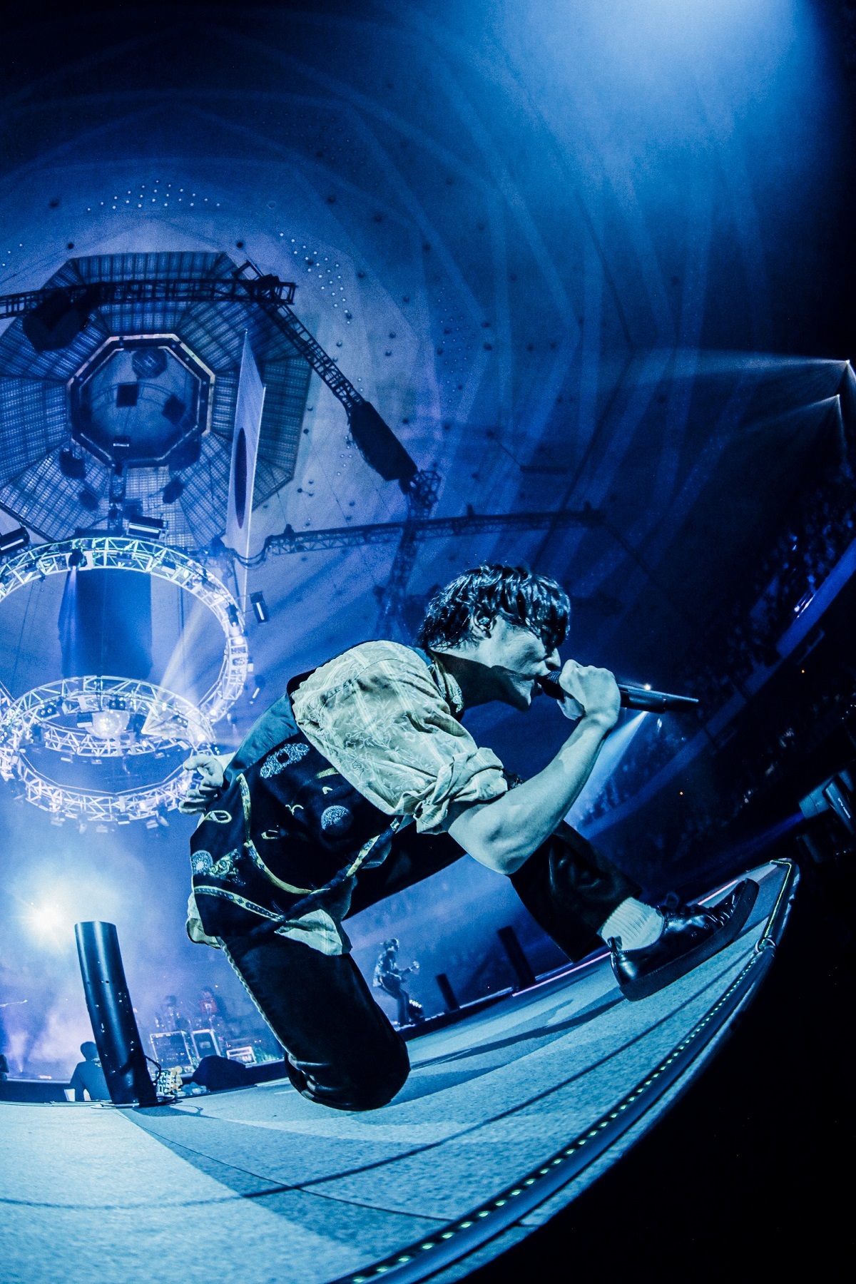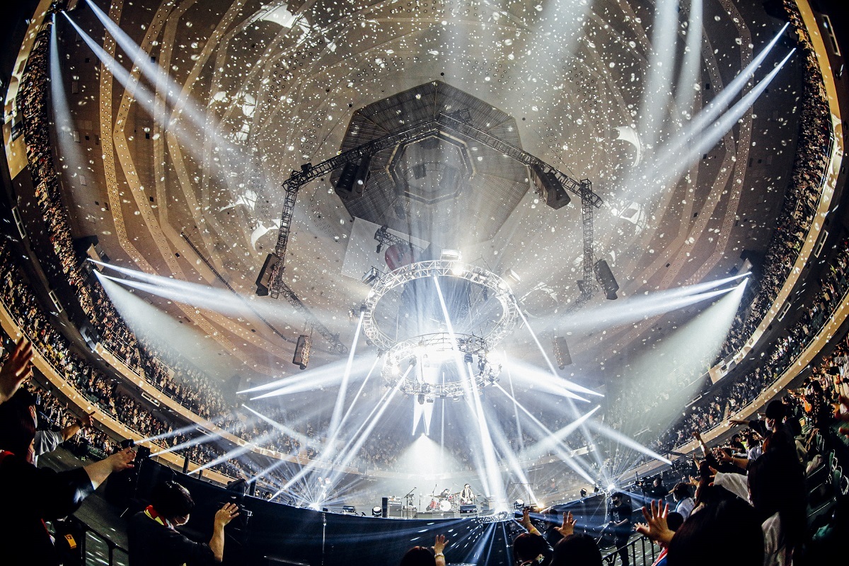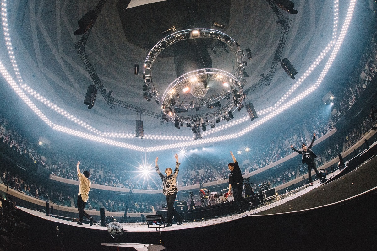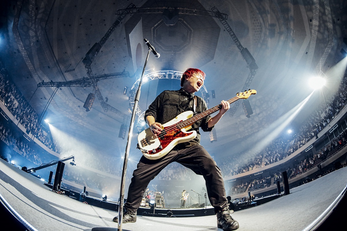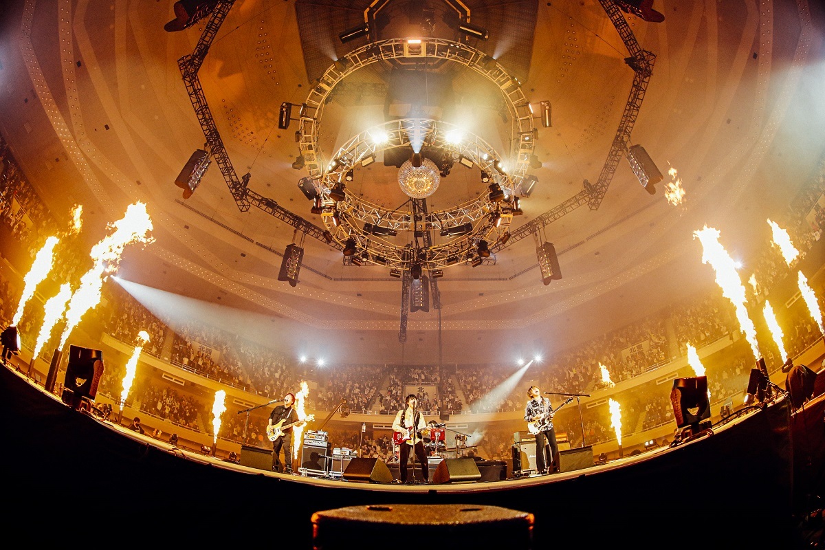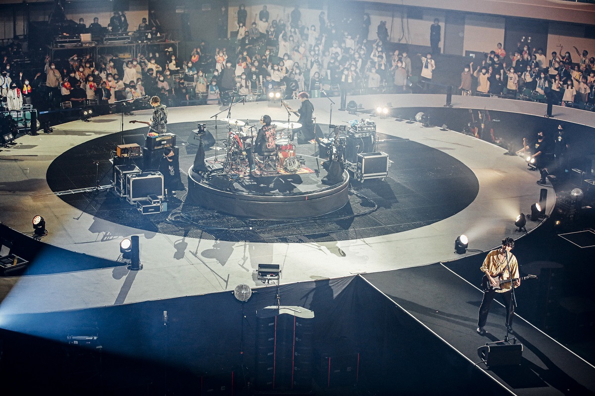 この日は客席を360°開放。アリーナの中央にあるステージからは3本の花道が伸びていて。途中にはマイクが立っているため、どこからでも唄える仕様だ。さらにドラム台は回転し、曲ごとに違う方角を向いている。見たことのないステージングだが、何とも彼ららしい。駆け回ったり、飛び跳ねたり、ときには寝そべったりしながら演奏する4人が、心から楽しそうなのが最高。いきいきとしたサウンドを目の前にしていると、(単独公演史上最大キャパの会場にも関わらず)「ステージが遠い」とは感じないし、孤独感に蝕まれる隙もない。それはメンバーも同じだったらしく、「みんなが近い」と頻りに言っていたのが印象的だった。